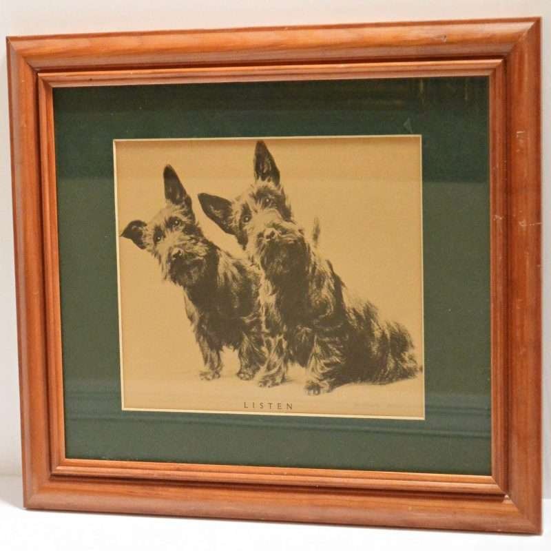 This print of two Scottish Terriers was originally produced by Morgan Dennis (1896-1960) for an advertisement for The Black and White Scotch Whiskey Company. It is perfect alone, but it would also be wonderful combined with other Scotties in different mediums: bronze, porcelain, ceramic, glass. Combine it with our Black & White Scotch Water Pitcher for a fabulous gift! Print = 13? long x 9? tall, With Frame = 18 1/2? long x 13 3/4? tall
