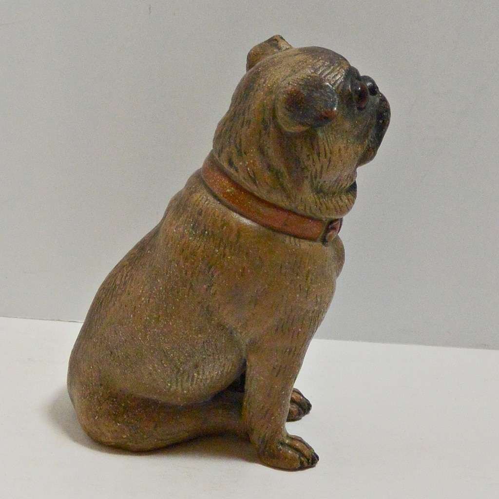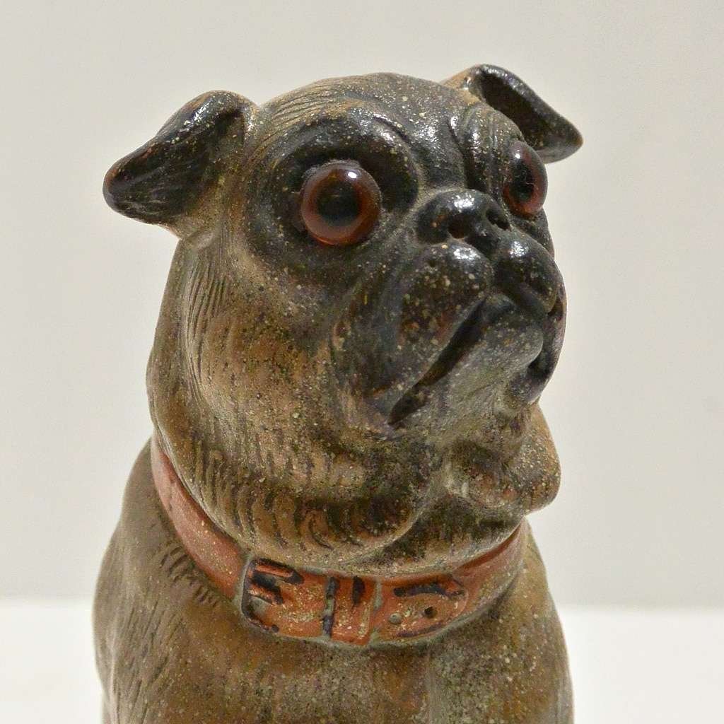 This exquisite terra cotta Pug dog originated in England in the late 19th century. It is beautifully-detailed with every fur line, skin fold and muscle shown in amazing detail.