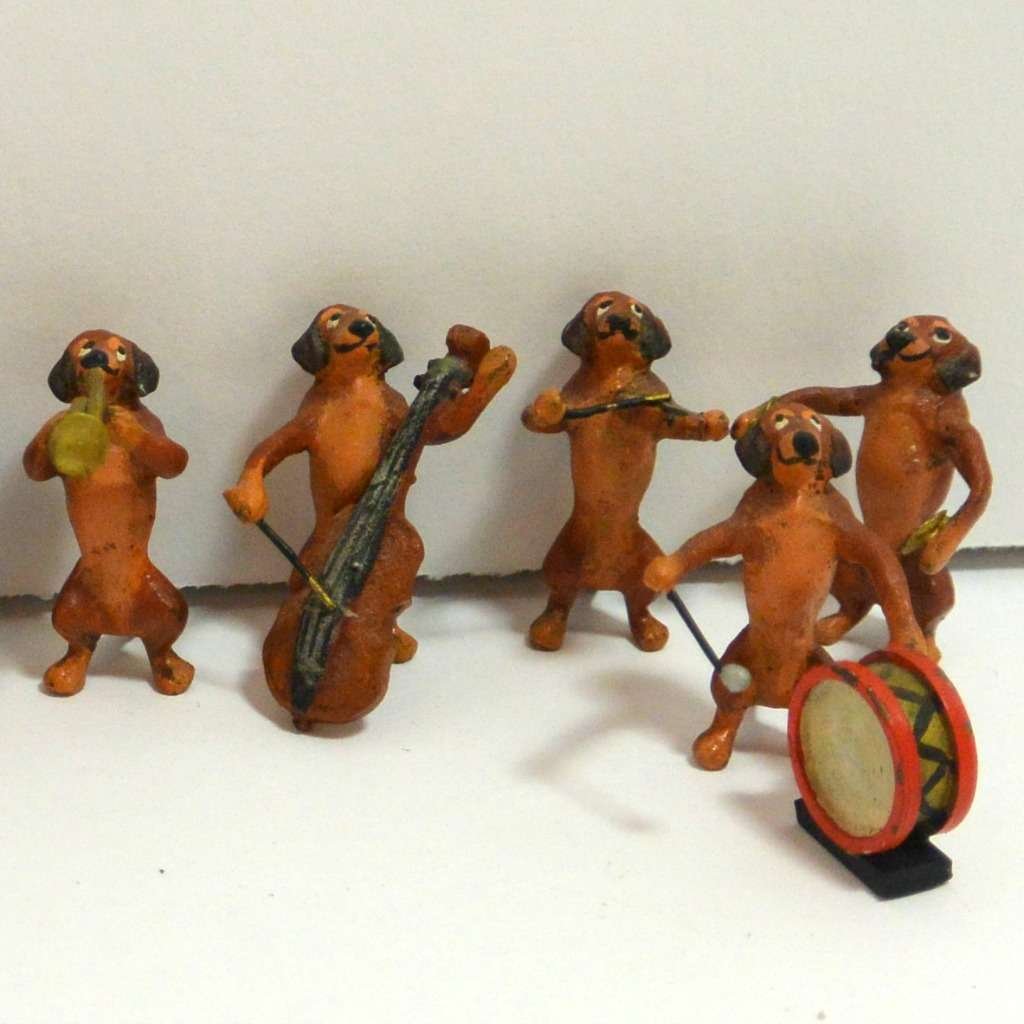 This delightful, vintage, cold-painted bronze orchestra is a Dachshund collector’s dream! Ten pieces in total includes: the conductor, 2 trumpets, a French horn, a bugle, a cello, a violin, a drum, cymbals, and a flute.