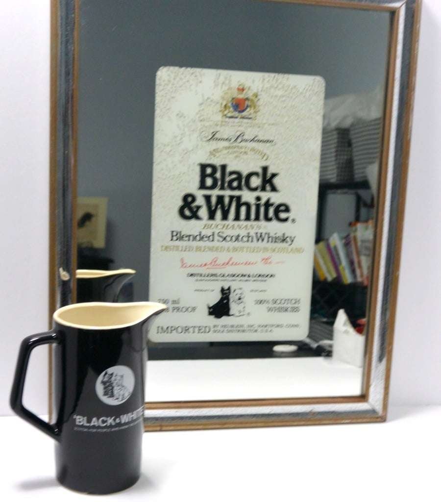 This wonderful, vintage, Black & White Scotch framed mirror and pitcher are being sold as a set. Designed for Heublein, Inc.
