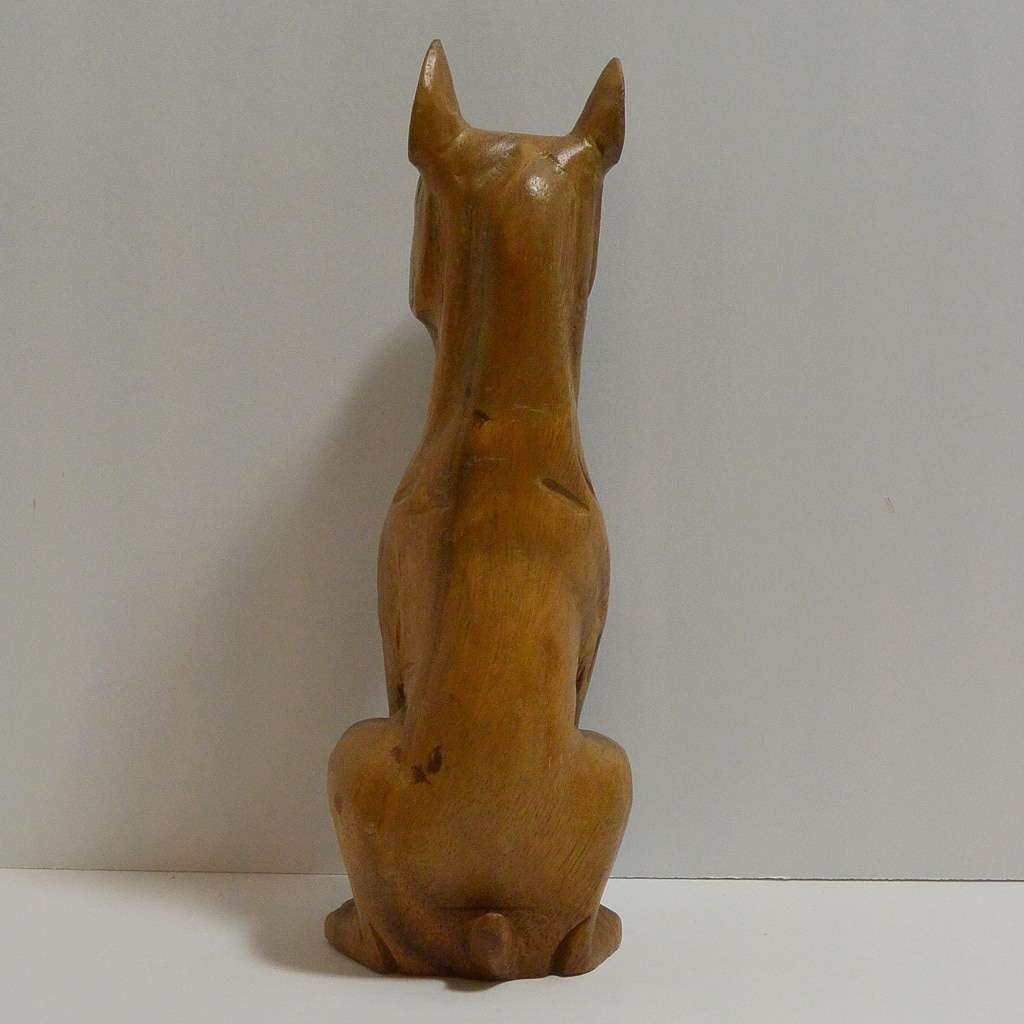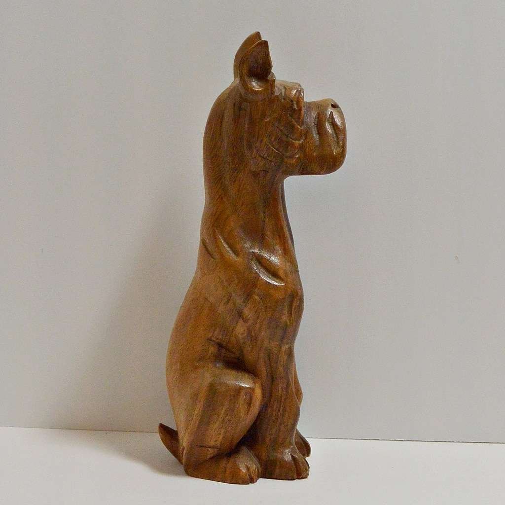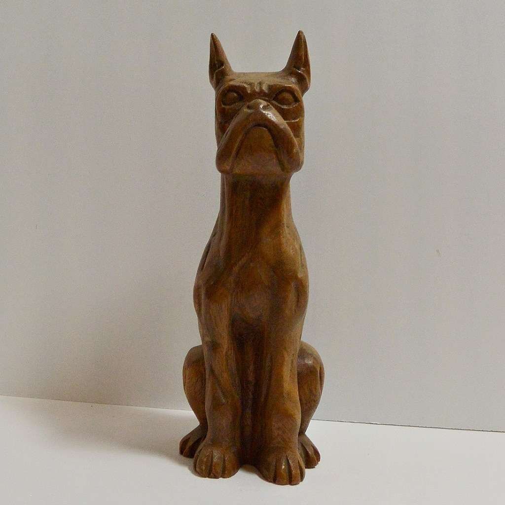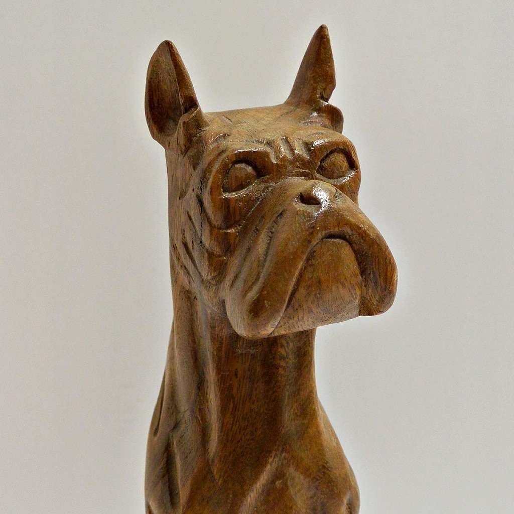 This Carved Wood Folk Art Boxer dog sits a full 10″ tall x 3 1/2″ long x 3 1/2″ wide.