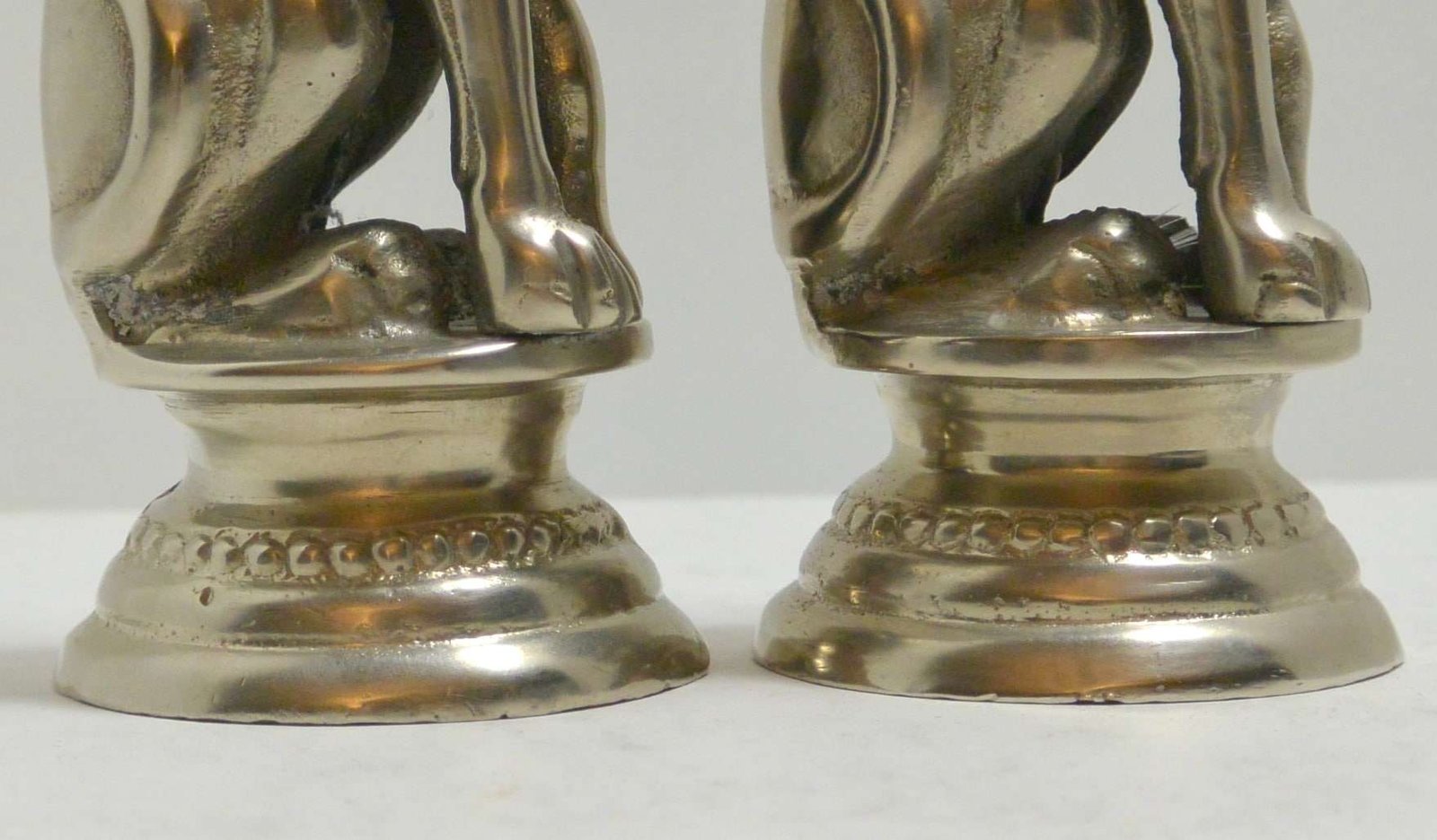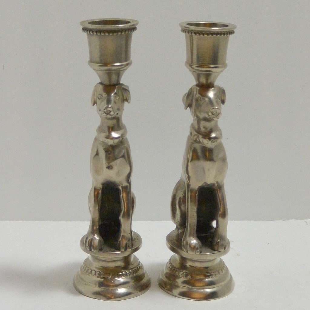 This perfectly matched pair of pewter candlesticks feature seated whippet dogs. Measuring 7″ tall with a base that is 2 1/4″ in diameter, they are in mint condition.