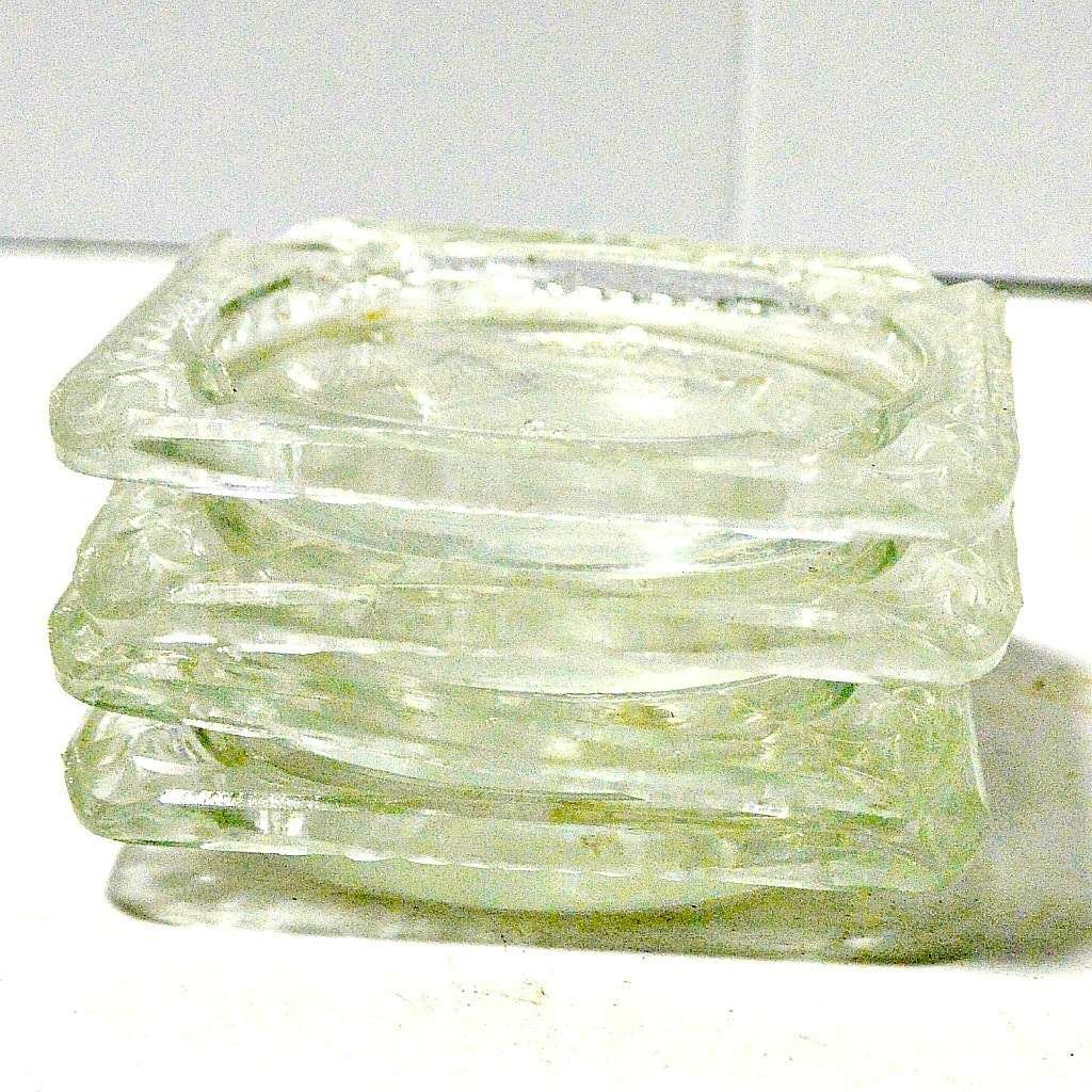 This is a wonderful set of four identical, cut glass ashtrays. Each one has a standing Airedale Terrier etched in its center. They are small, measuring 2 1/2 x 2 !/2 each. They also fit nicely inside each other to form a short stack.