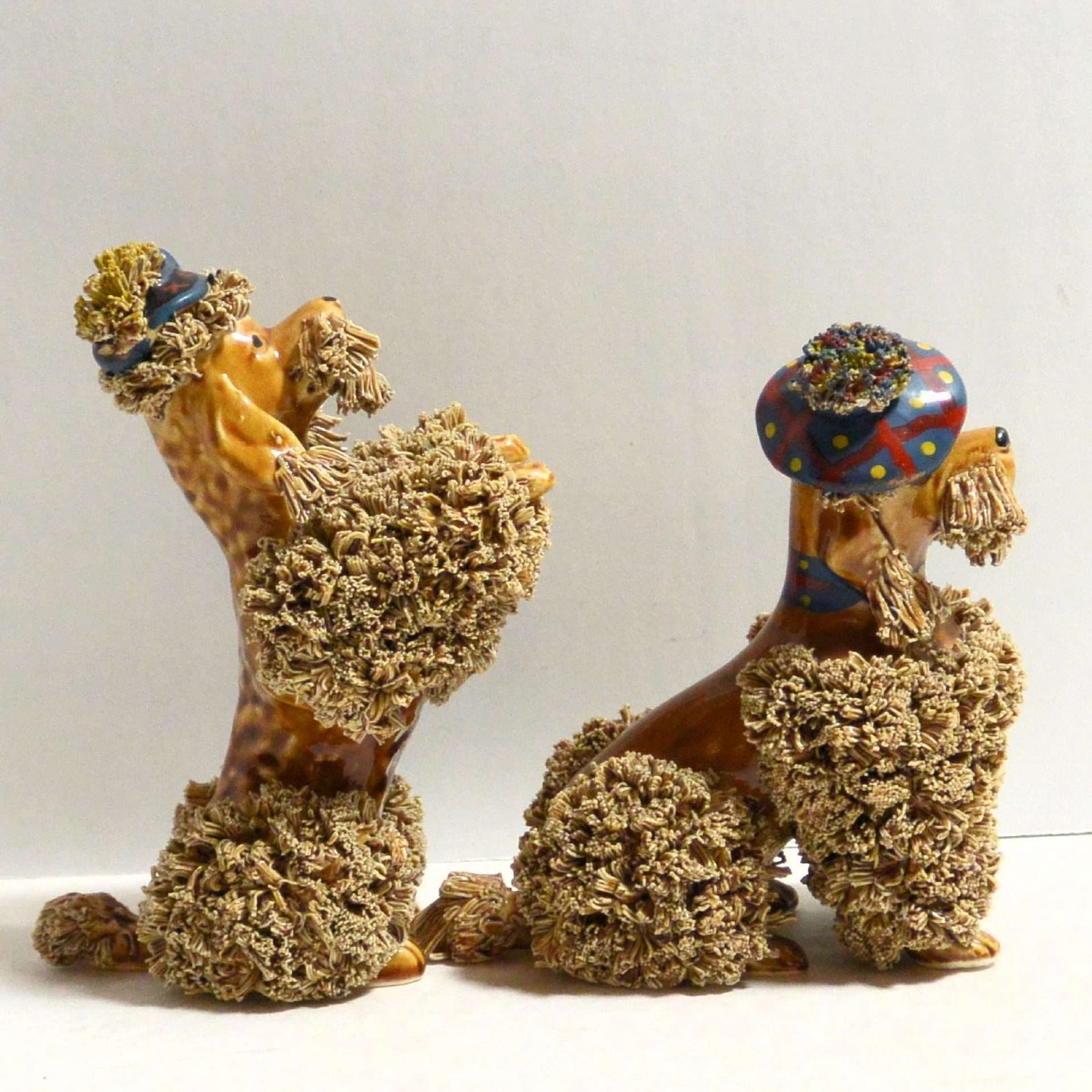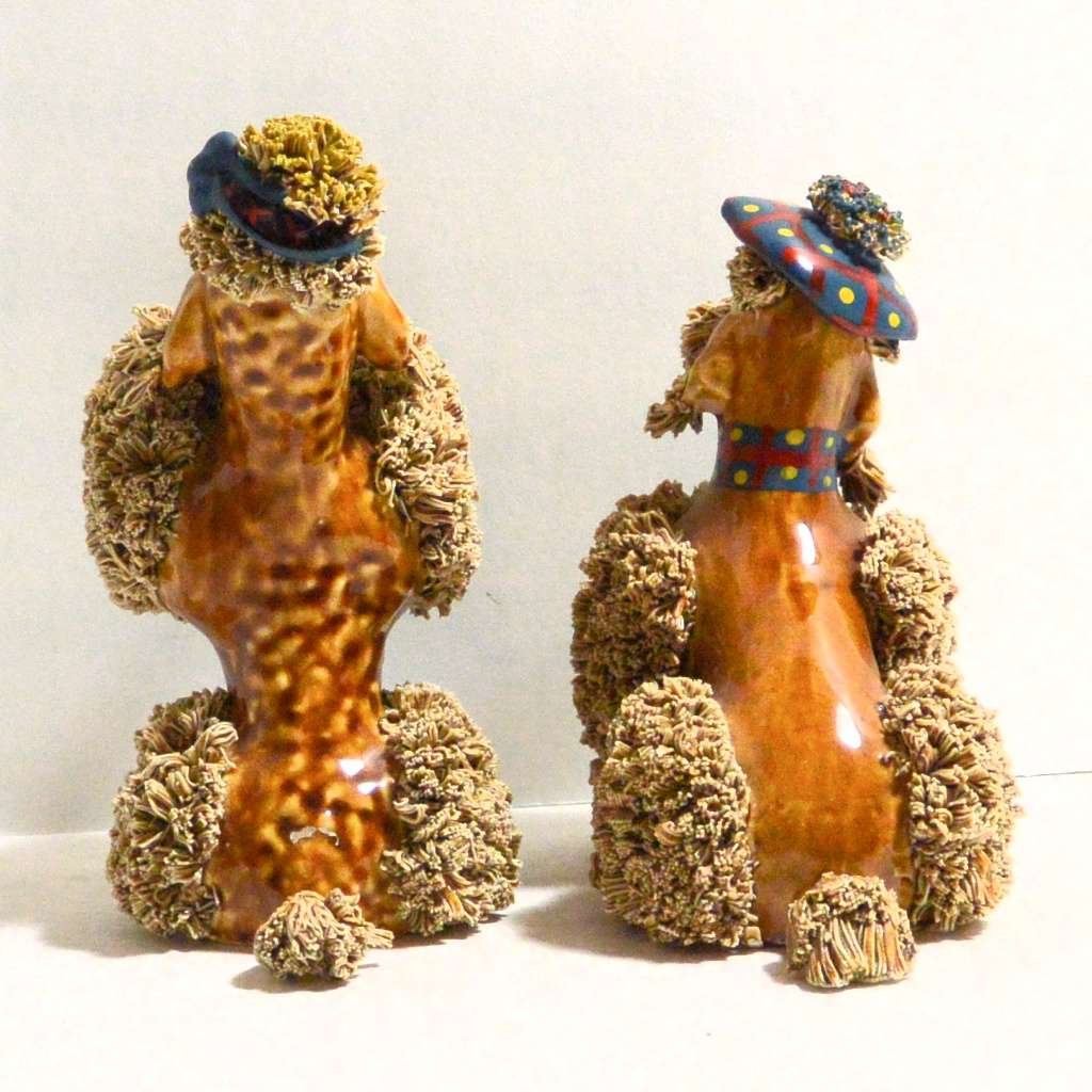 This fabulous spaghetti poodle pair are all decked out for a stroll about town. The seated dog measures 5 1/2″ tall x 5″ long x 3″ wide. The begging dog measures 6″ tall x 3″ long x 3″ wide.