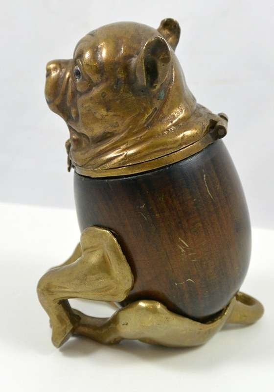 In the classic tradition of Arthur Court designs, this fascinating Pug is made of highly detailed bronze with an oak wood body and glass eyes. He sits 5 1/2″ tall x 4″ long x 3 1/2″ wide, and opens to reveal a copper lined inkwell. It is embossed on the underside: “Arthur Court Designs copyrighted 1979”. The oak wood body has a few minor surface scratches, but this wonderful dog is otherwise in great shape. This is a great chance to own a very substantial, vintage piece by a famous designer. He will look amazing as a piece of intricately-designed desk art, or an excellent addition to any inkwell collection.