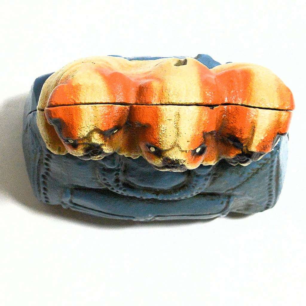 This vintage, cast iron bank features three fabulous Bulldogs, peeking out from a purse or a duffel bag. Just as sweet as can be, these “bad boys” look definitely tough enough to guard your life savings.