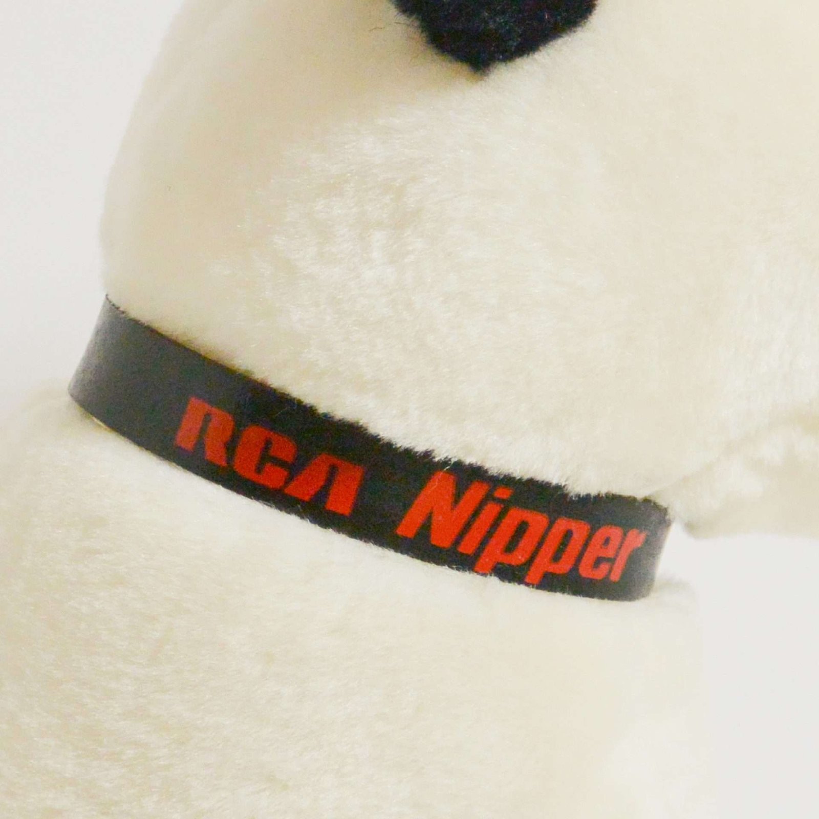 He is sporting a black and red collar with the words “RCA Nipper” on it.