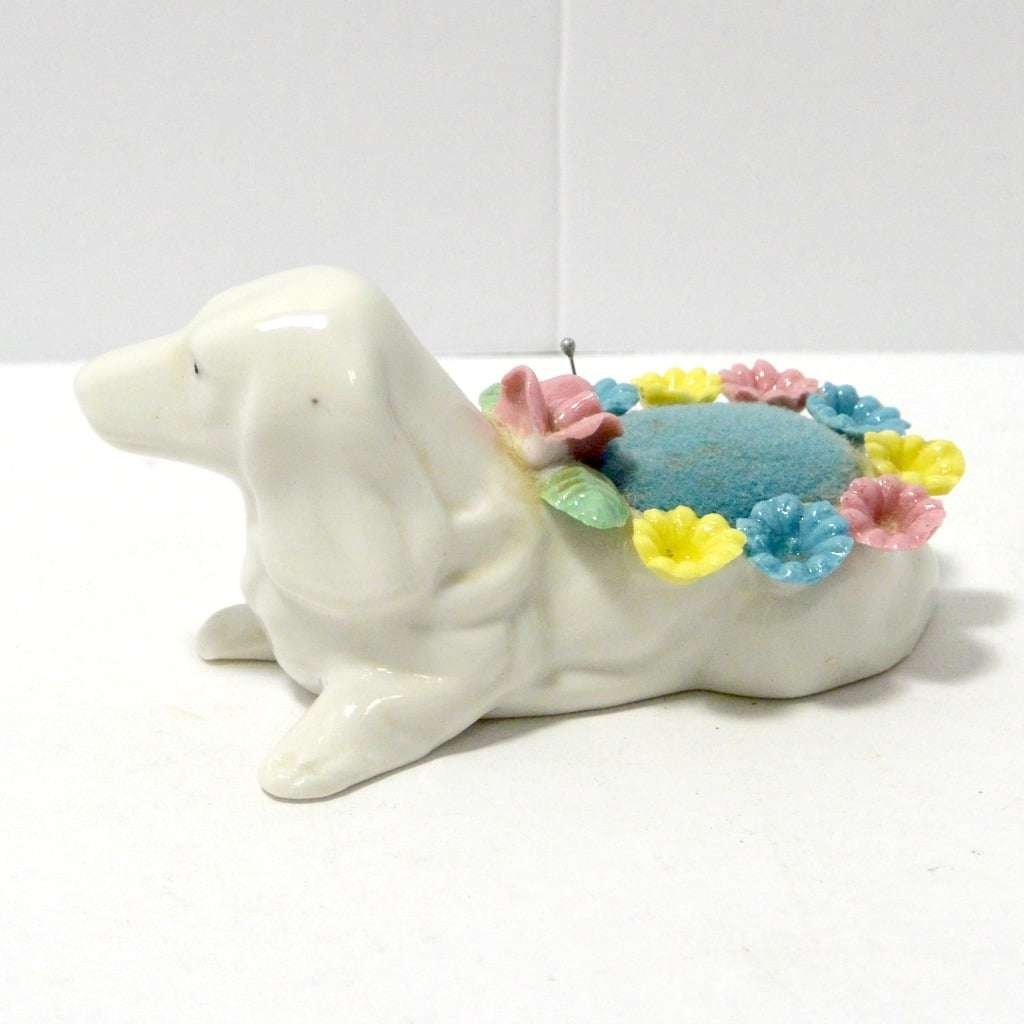 This sweet, white porcelain Dachshund dog, looks very content to watch you stitch away, as she dutifully holds your straight pins. She measures 2 1/4″ tall x 4″ long x 2″ wide, and she is in excellent condition.