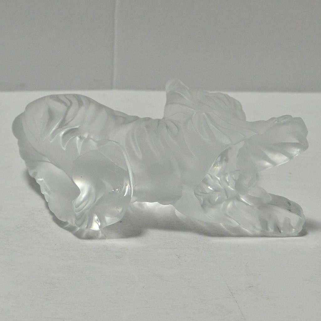 This exquisite,Yorkshire Terrier figurine was designed and manufactured by Lalique of France. Measuring 3″ tall x 4″ long x 2″ wide it is made of frosted crystal. It is in excellent condition.