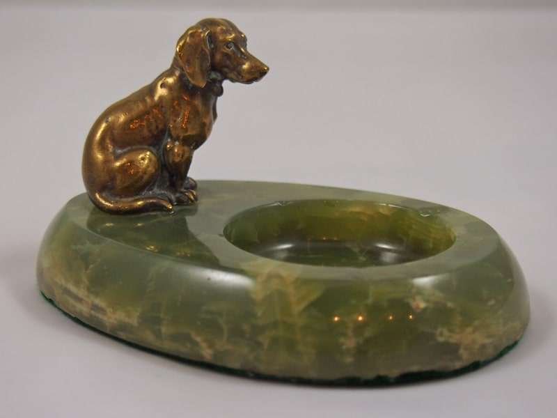 This highly detailed miniature bronze Dachshund is proudly guarding whatever might get placed in the green marble dish. This piece is in good condition with the exception of a small chip along the top edge of the dish. It is somewhat difficult to see, due to the marbled stone, but you can feel it when you run your figure tip around the inside edge of the dish. Nonetheless, it is still quite a beautiful piece that would make a wonderful desk top accessory, or a dresser-top coin or cufflink dish. The bottom is already covered in “putting green” green felt, to avoid any scratching of furniture.