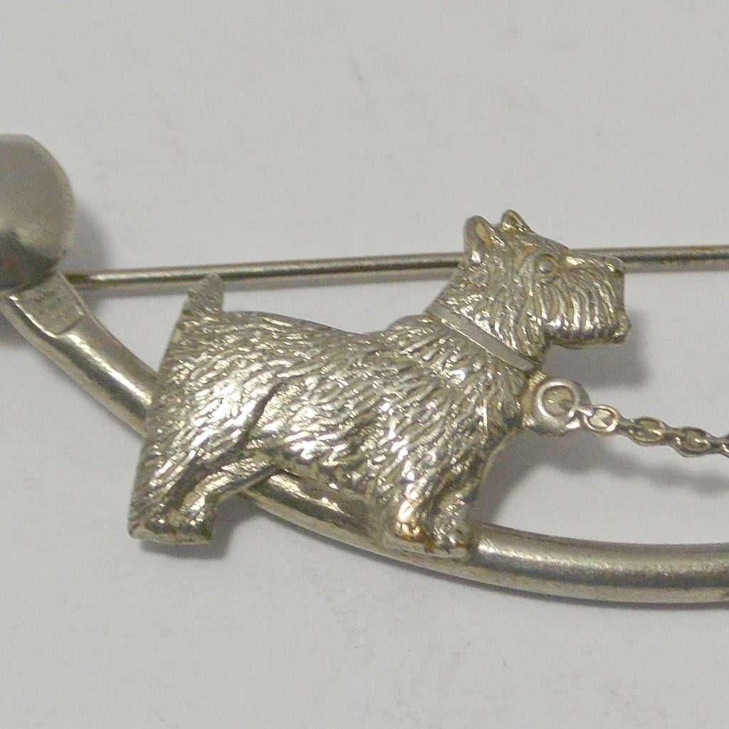 This wonderfully unique, vintage pin, sports a matched pair of adorable Scottish Terriers, attached to each other by a fine chain. Measuring 1″ tall x 3″ long, they are mounted on a silver plate, curved base.