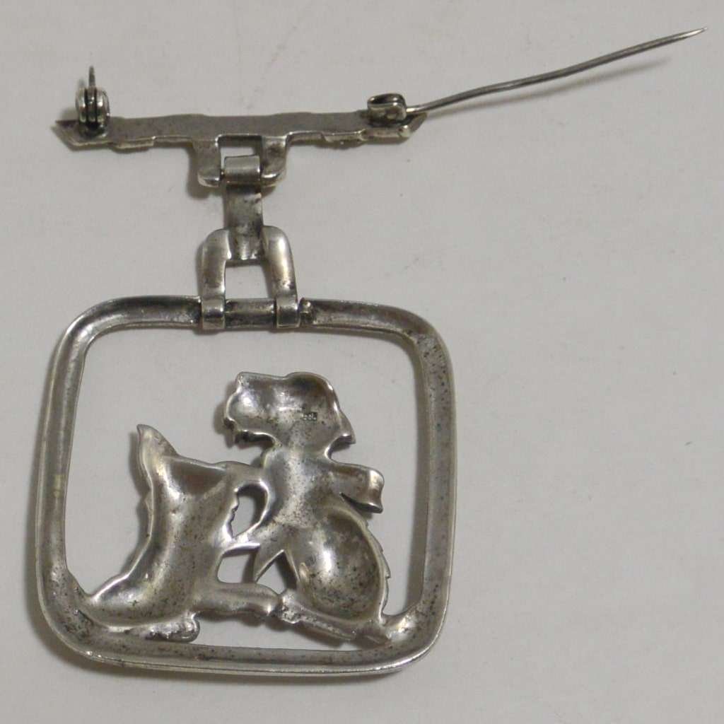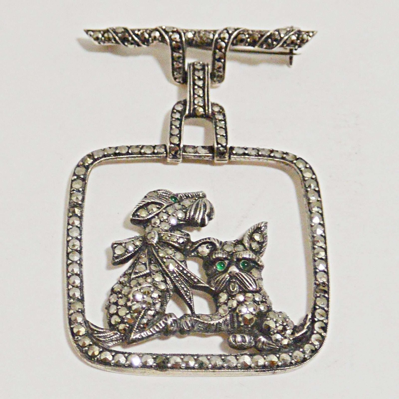 It features two very sweet Scottish Terrier dogs with lovely emerald green paste stone eyes. It is hallmarked “935” on the back of the larger dog’s head.