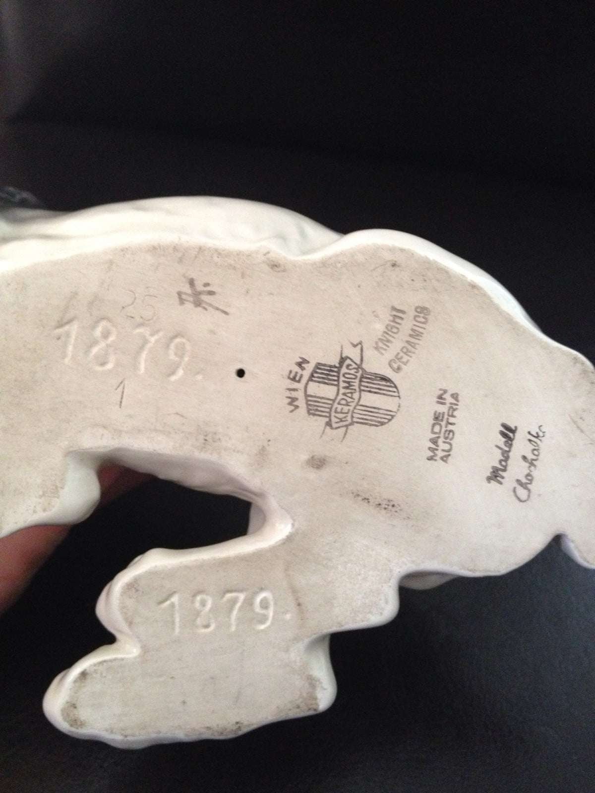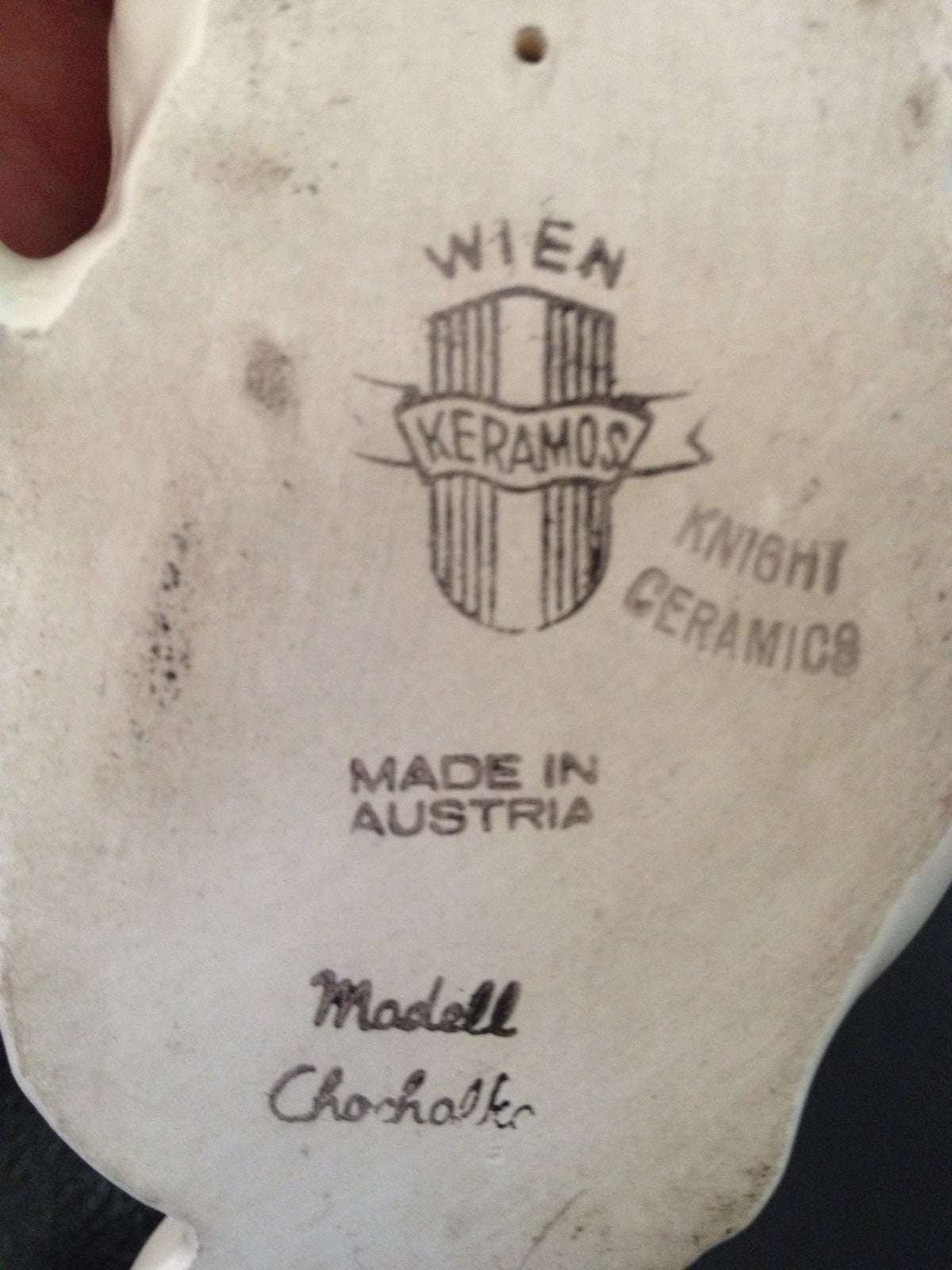 This engaging porcelain Springer Spaniel figurine was designed in Wien/Vienna Austria by Rudolf Chocholka (1888-1958), who was well known for his magnificent animal sculptures. Manufactured in the Keramos Porcelain Factory, it is numbered “1879”, signed by the artist, and it bears the Wien Keramos stamp.