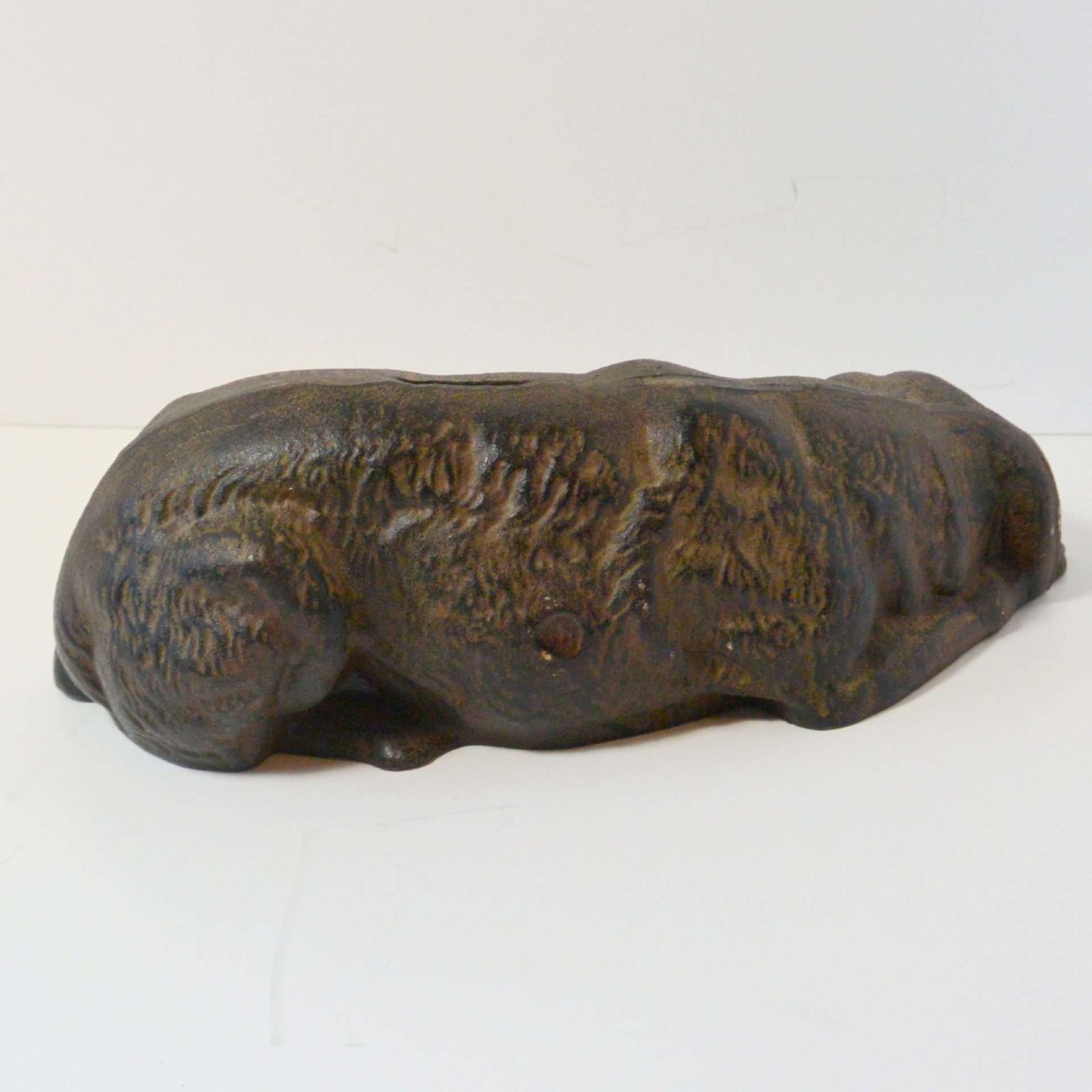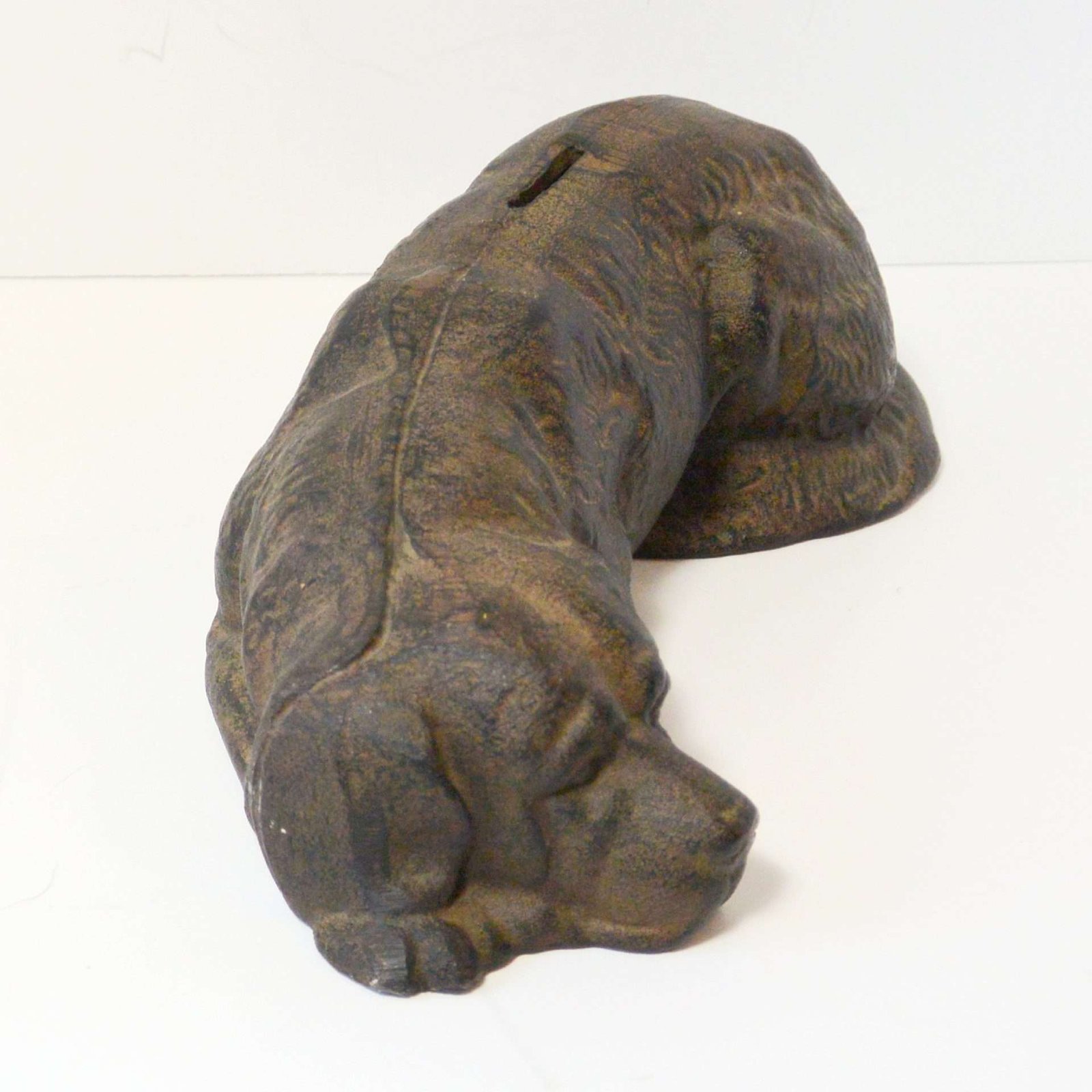 This unique and wonderful, antique cast iron still bank was created to look like a Newfoundland dog at rest.