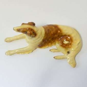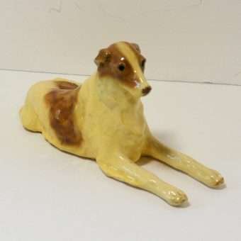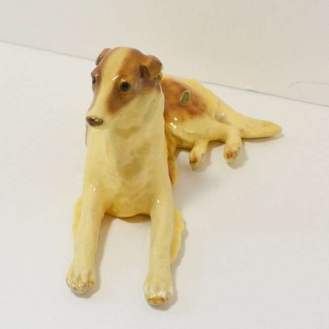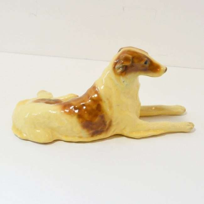 This truly elegant Borzoi dog figurine is reclining with her head held high and her expression alert.