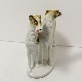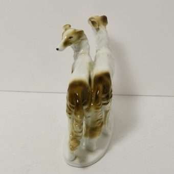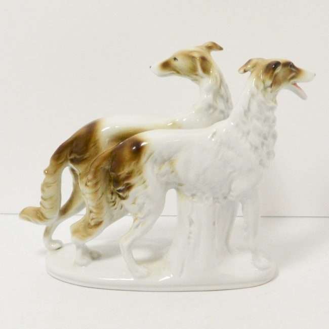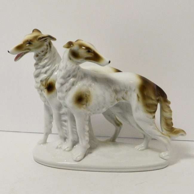 These beautiful porcelain Borzois appear to be best friends, as they walk along together.