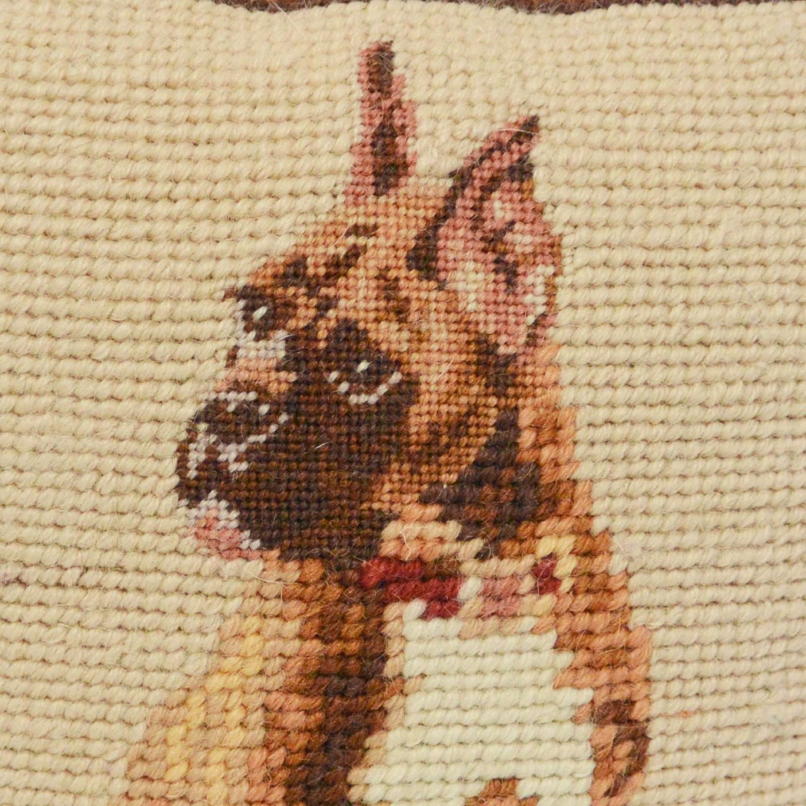 The needlework is an exquisite combination of petit pointe stitching on the dog’s head and face, and needlepoint on his body and background.