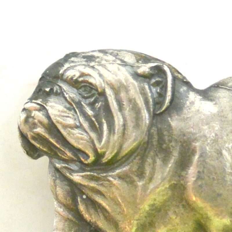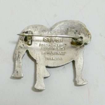 This wonderful vintage Bulldog pin was made by the Kenart company in England between 1950 – 1980. It is a highly-detailed, standing Bulldog, made of metal with a silver tone finish. It is signed “Kenart” and has the registration #534107 stamped on the back.