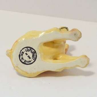 The designer of this figurine, Oscar Morten, immigrated from Sweden to the U.S. and opened a gift ware studio in Chicago in 1931. Over the next two decades, he created over 300 popular dog and horse models. Composed of ceramic over a metal skeleton, these figurines, although beautiful and engaging, were prone to crazing and flaking, thus making it difficult, today, to find examples in perfect condition.