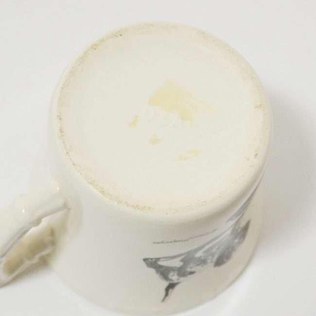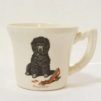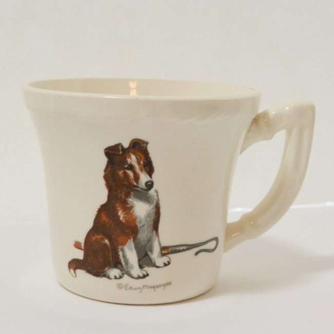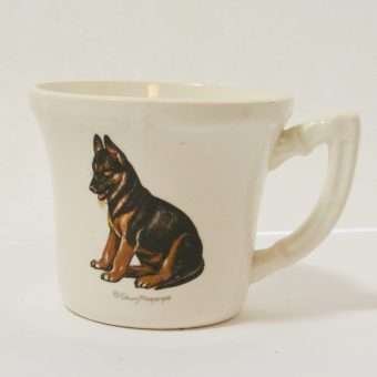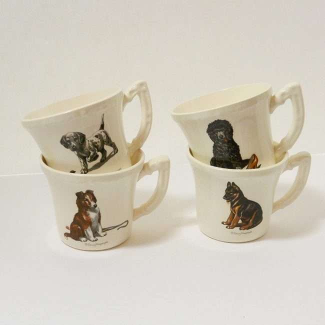 The set includes a Collie, a Poodle, a German Shepherd, and a Pointer. All were designed using the vintage art of Edwin Megargee, 1883 – 1958), an American artist, illustrator and author who specialized in award-winning dogs and thoroughbred horses. The artist’s signature is on each cup.