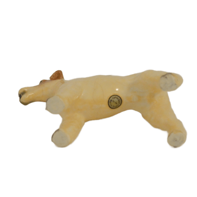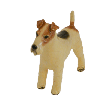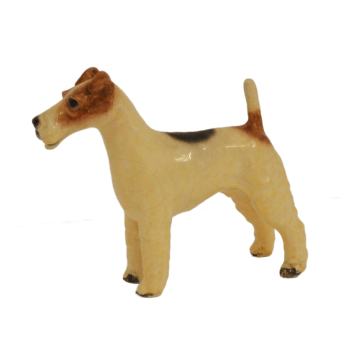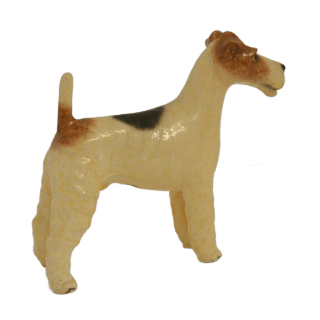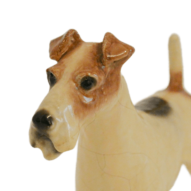 This, Wire-Haired Fox Terrier was designed by Mortens Studio of England. The designer of this figurine, Oscar Morten, immigrated from Sweden to the U.S. and opened a giftware studio in Chicago in 1931. Over the next 32 years, he created over 300 popular dog and horse models. Composed of ceramic over a metal skeleton, these figurines, although beautiful and engaging, were prone to crazing and flaking, thus making it difficult, today, to find examples in perfect condition.