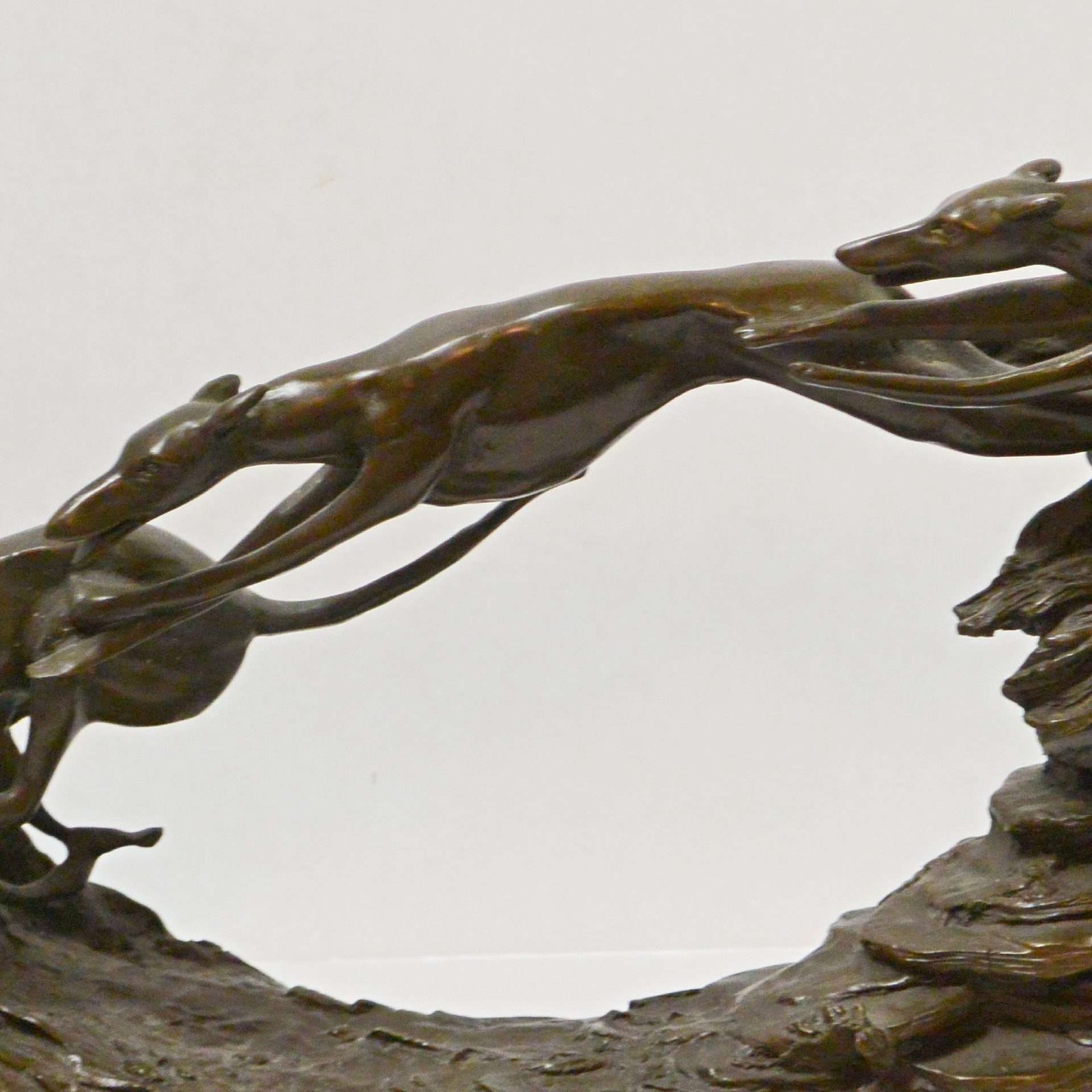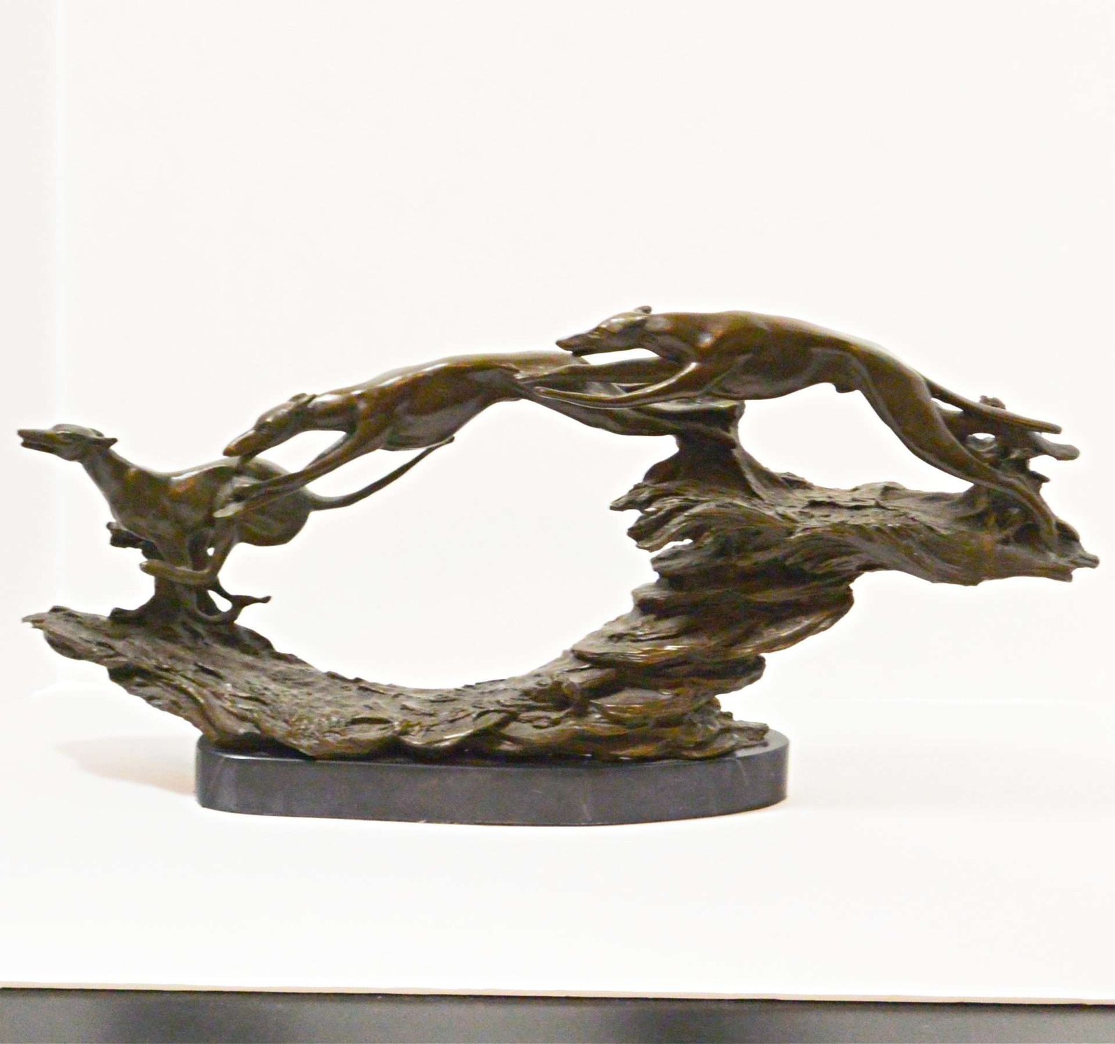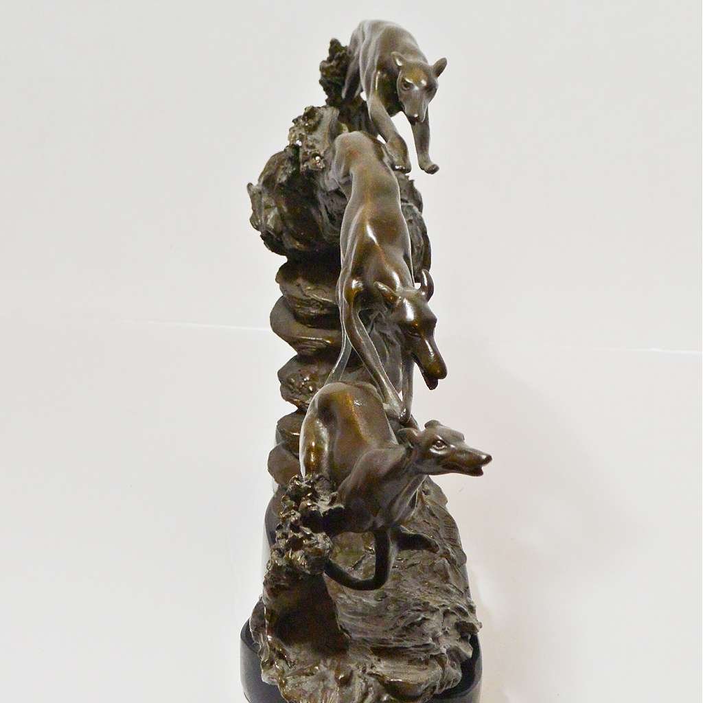 One of the most fascinating features of this stunning bronze study of Greyhounds is that you can describe it in two ways. First, it can be seen as a moving and powerful example of three adult Greyhounds racing over rocky terrain. However, it has also been described as a study of a single Greyhound and the natural progression of the dog’s leap, as it races over rocky terrain.