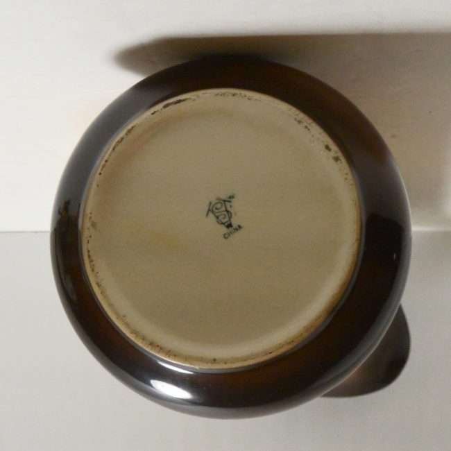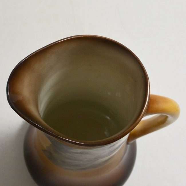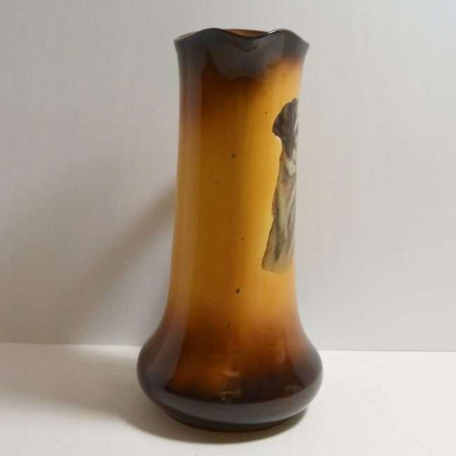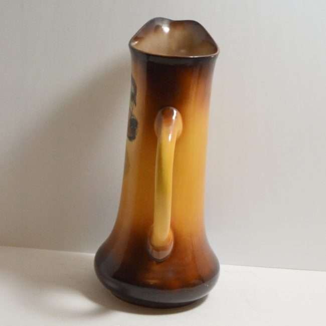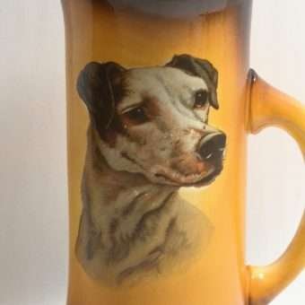This large, antique pitcher was designed and manufactured by the Taylor Smith & Taylor Pottery Company of Chester, West Virginia between 1908 – 1915. Warm gold and brown tones provide the background for a highly detailed portrait of a dog.