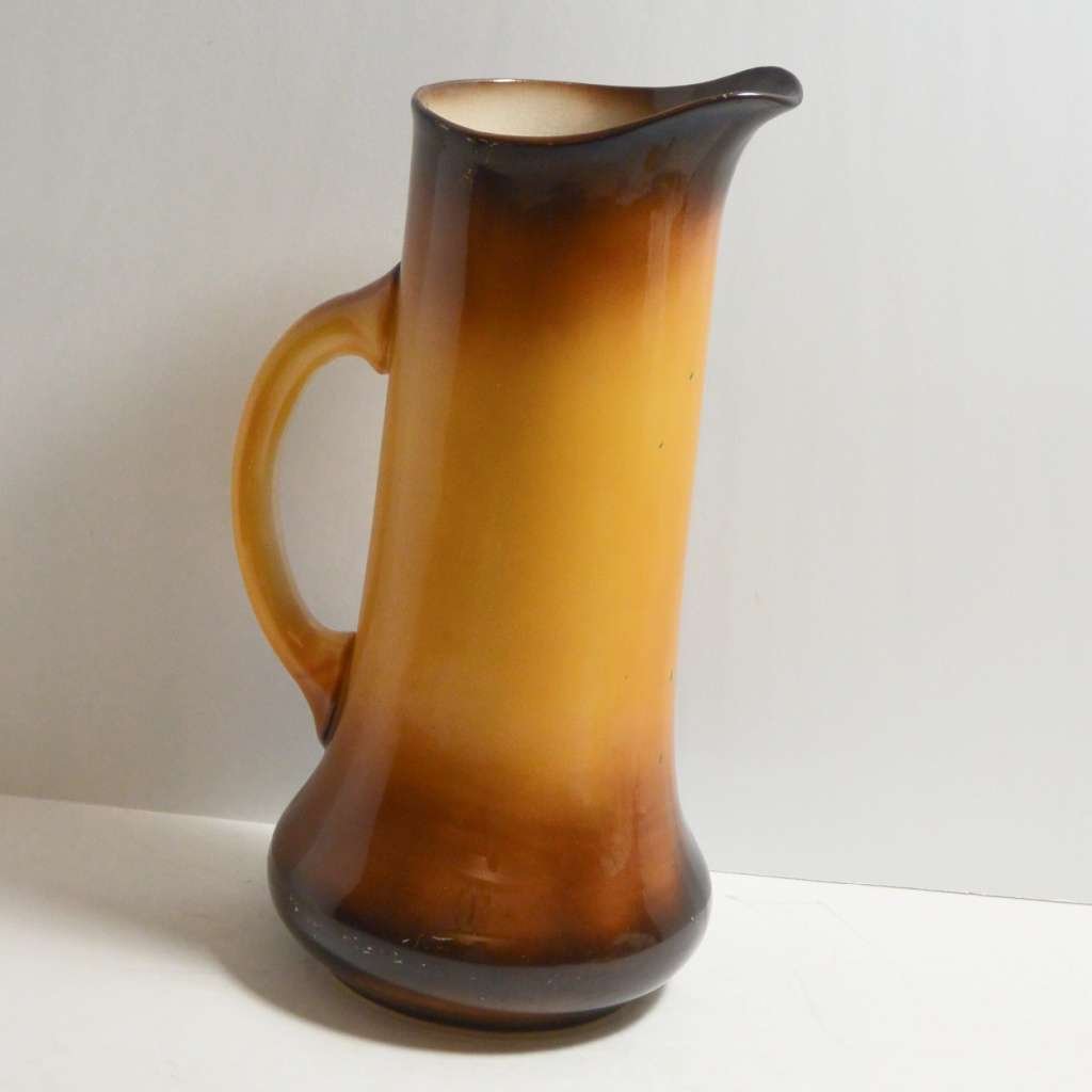 This large, antique pitcher was designed and manufactured by the Taylor Smith & Taylor Pottery Company of Chester, West Virginia between 1908 – 1915. Warm gold and brown tones provide the background for a highly detailed portrait of a dog.