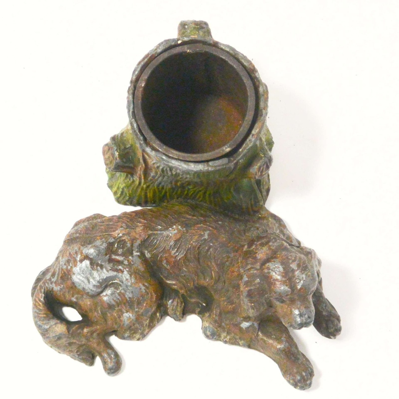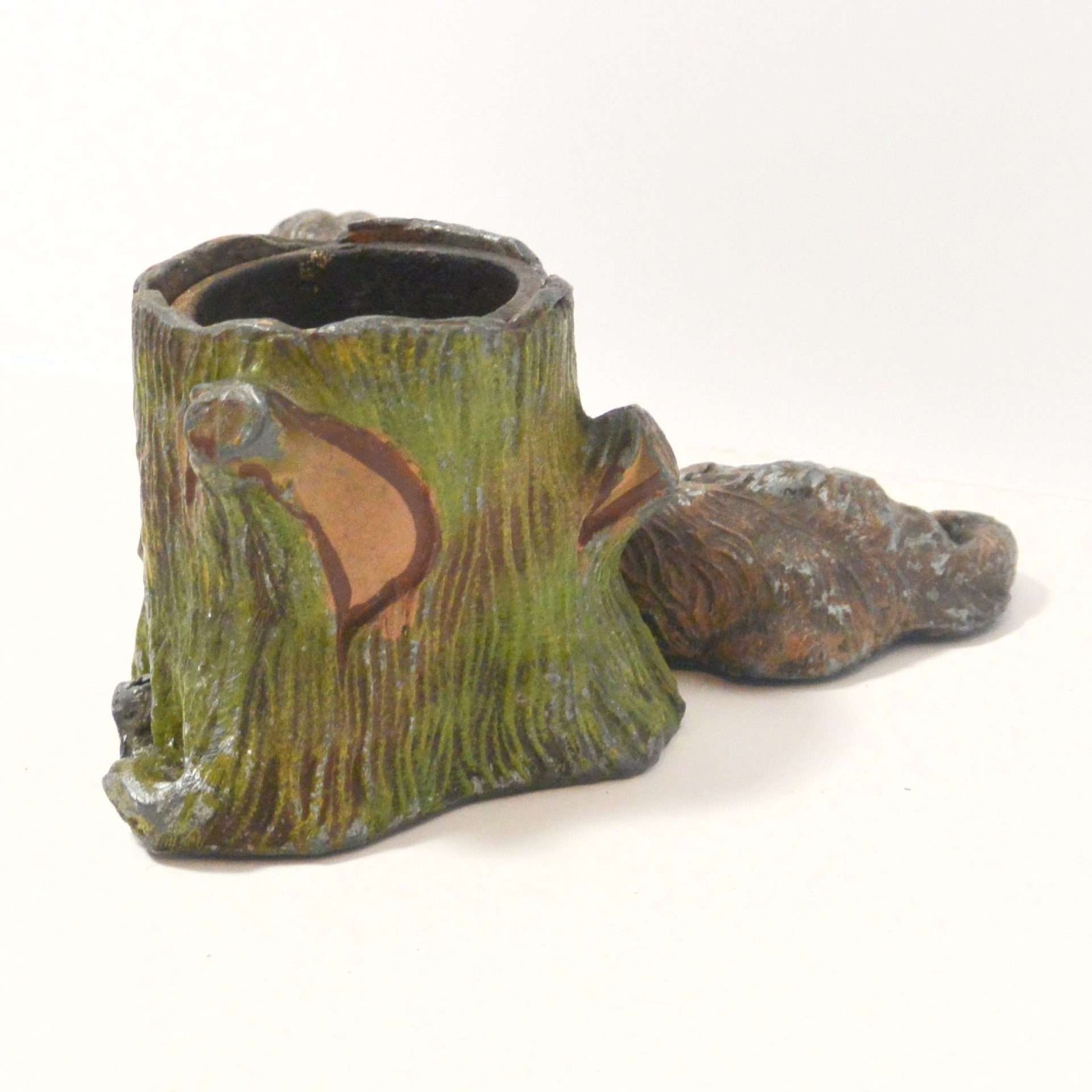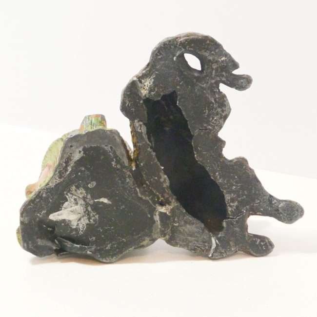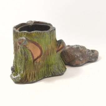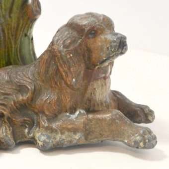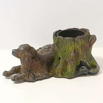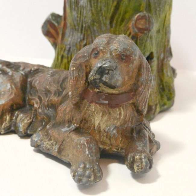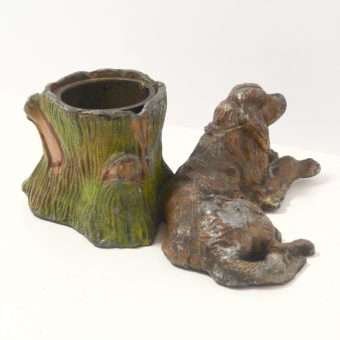 This is a very old piece. It has a removable metal insert inside the tree trunk. There are spots of missing paint, a crack along the side of the dog’s leg, and a area where the metal along the bottom side of the tree trunk is missing.