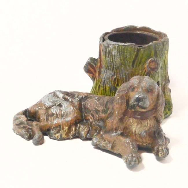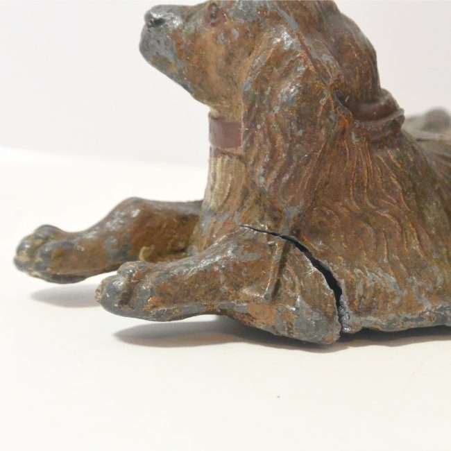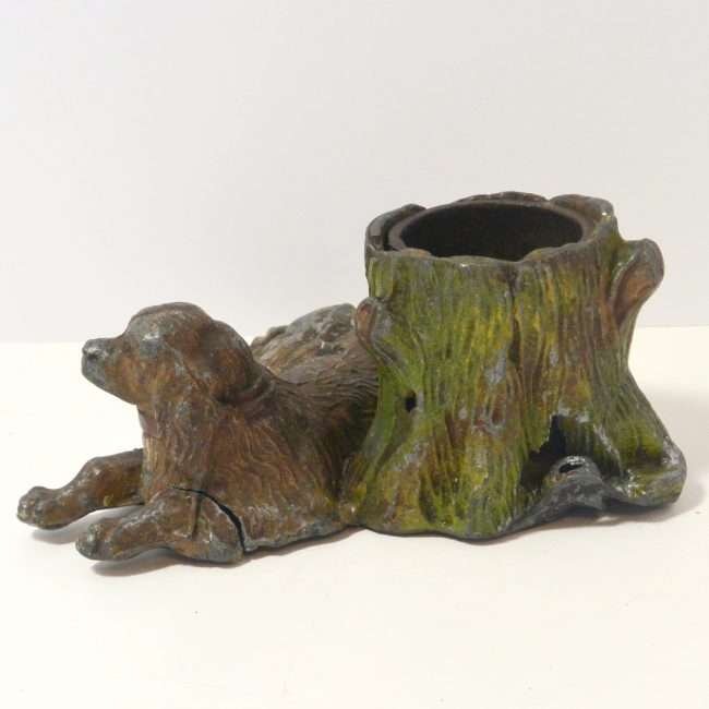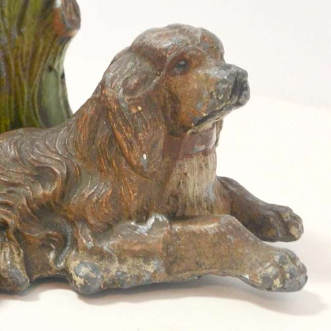 This antique painted metal figurine of a dog relaxing near a tree is also a matchstick holder.