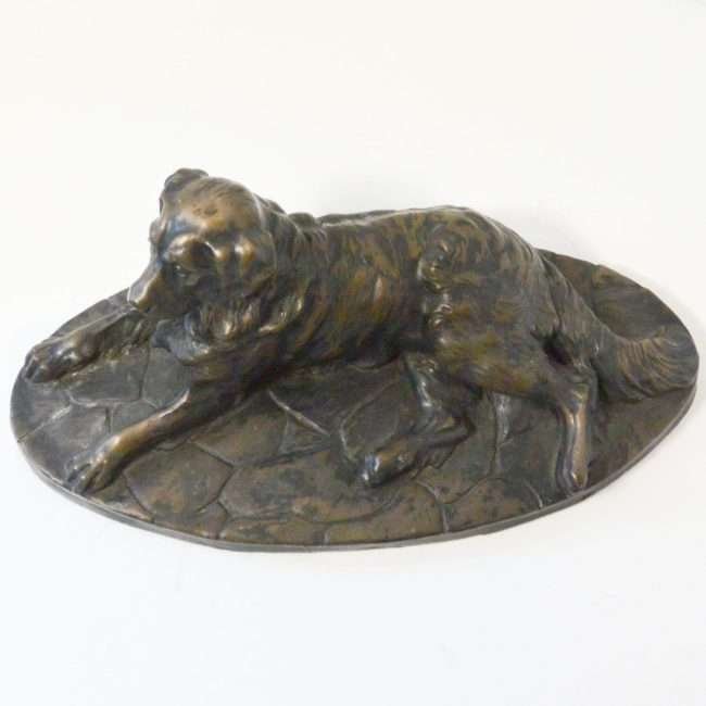 The detailing on this bronze dog is extraordinary. In this full-body stretched-out pose, with his head held high and straight, he is a portrait of an easy-going personality and awesome intelligence.