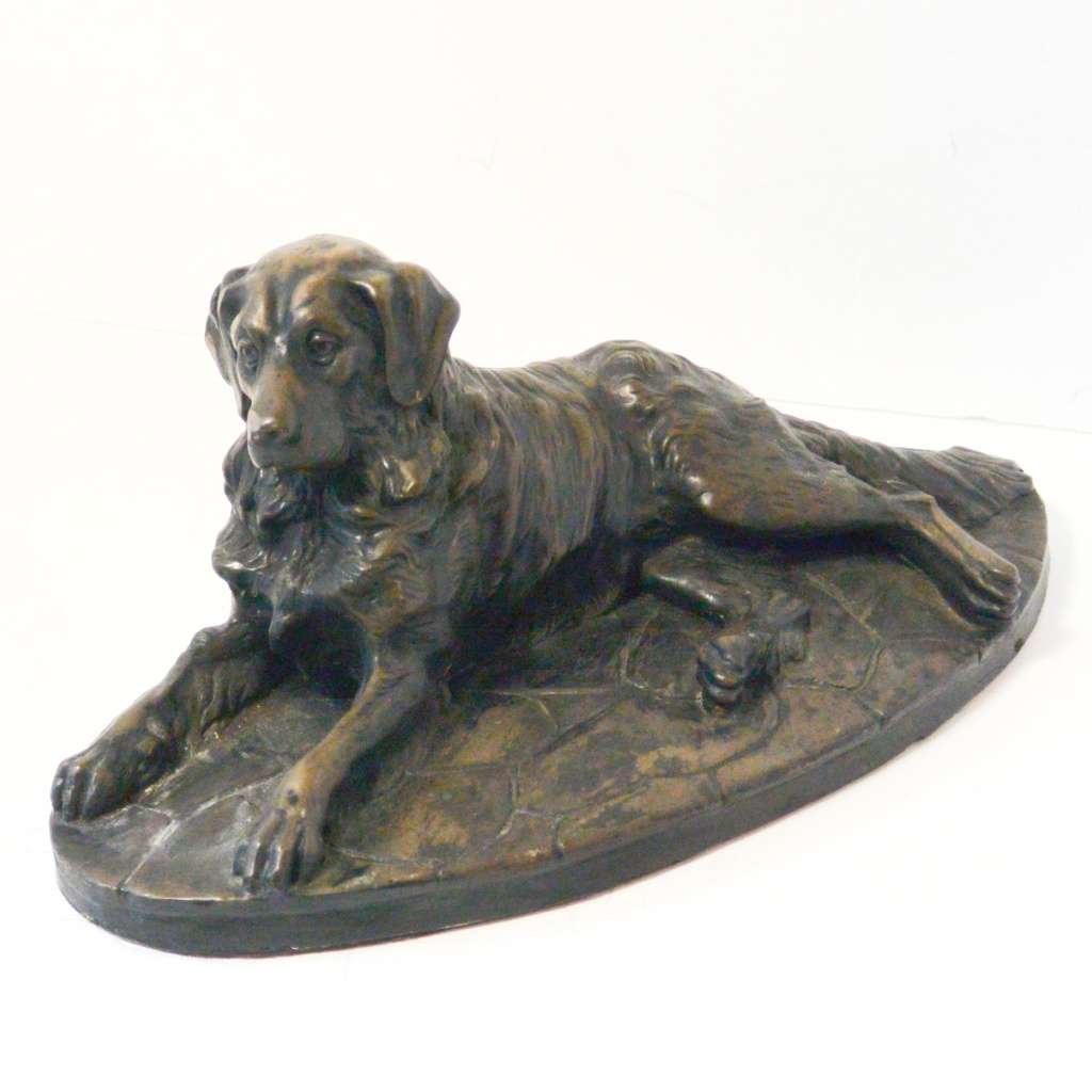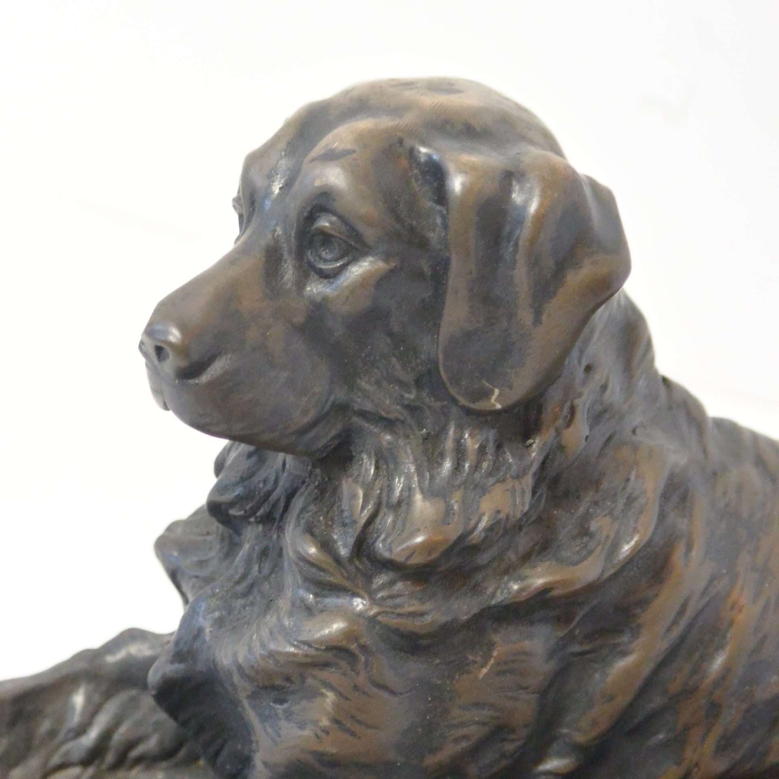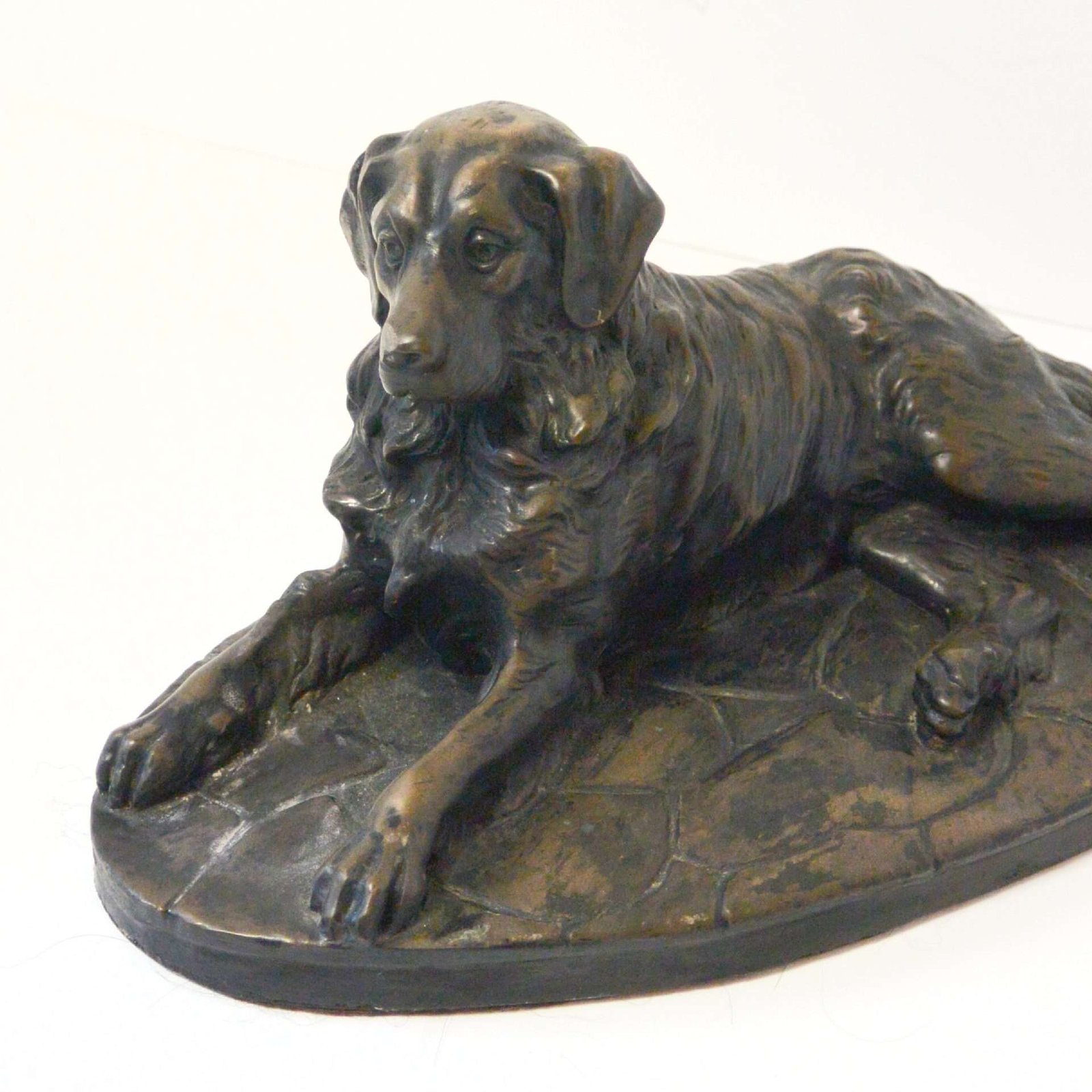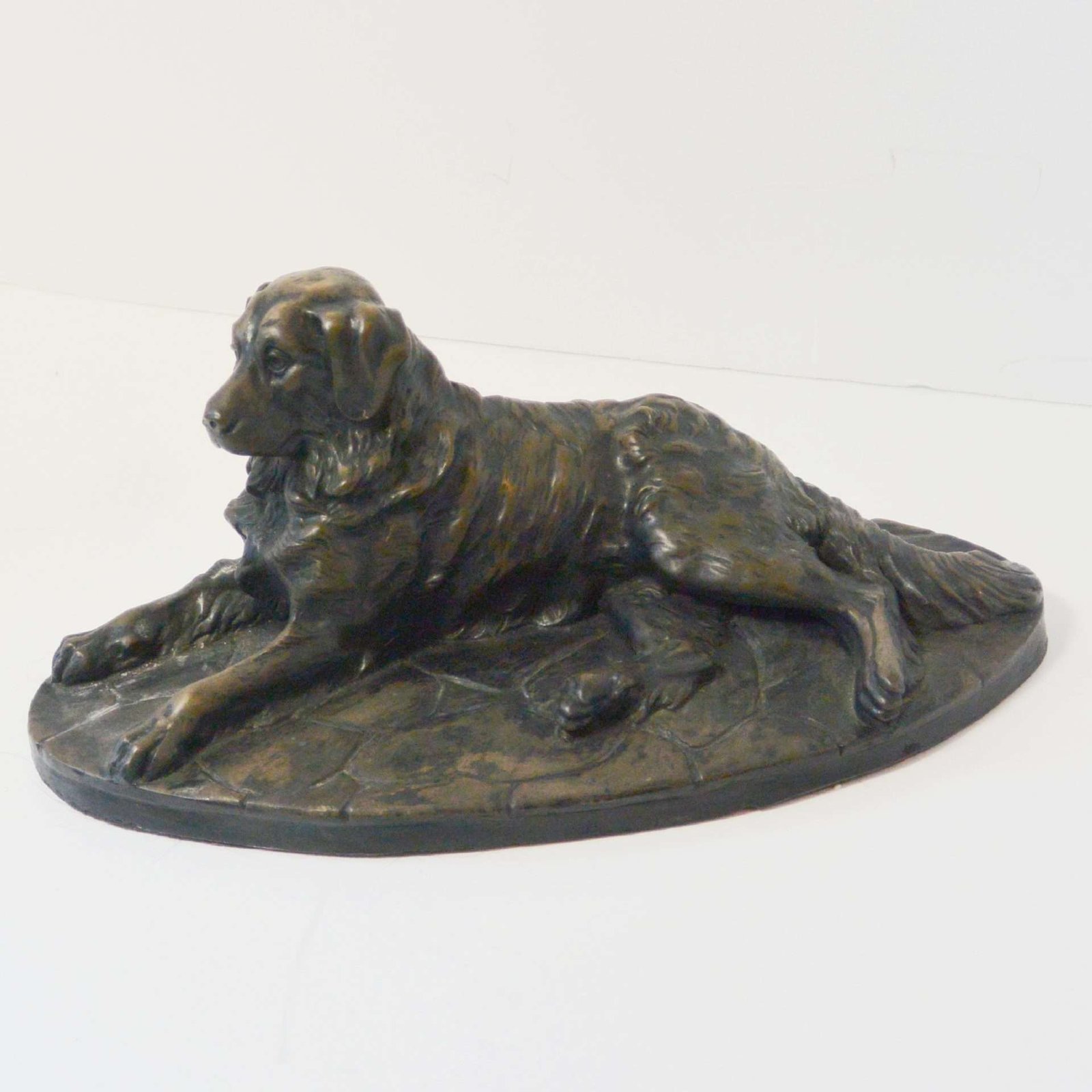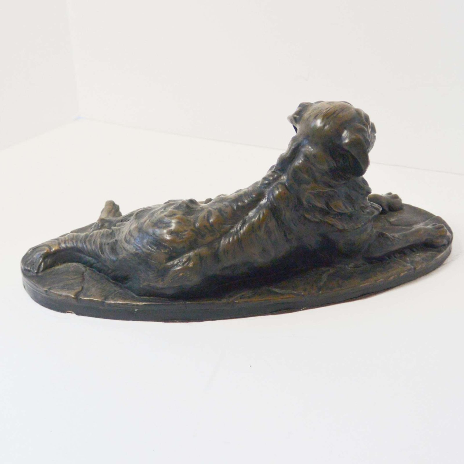 The detailing on this bronze dog is extraordinary. In this full-body stretched-out pose, with his head held high and straight, he is a portrait of an easy-going personality and awesome intelligence.