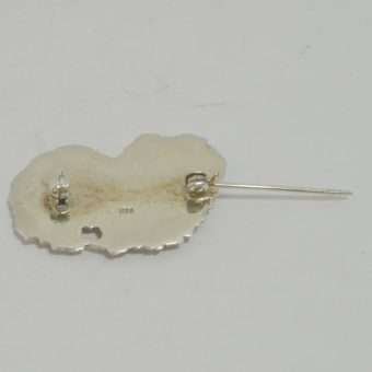Measuring 1″ tall x 1 1/2″ long, this Pekingese pin is in excellent condition, with a “c” clasp, and a straight, working pin. It carries both the Kenart stamp on the back as well as the registration number, and the word “Silver”.