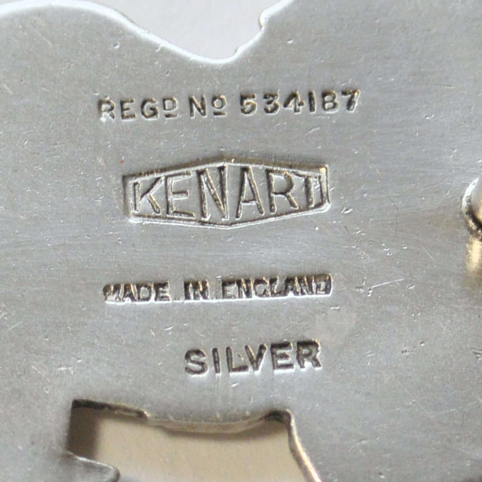 Measuring 1″ tall x 1 1/2″ long, this Pekingese pin is in excellent condition, with a “c” clasp, and a straight, working pin. It carries both the Kenart stamp on the back as well as the registration number, and the word “Silver”.