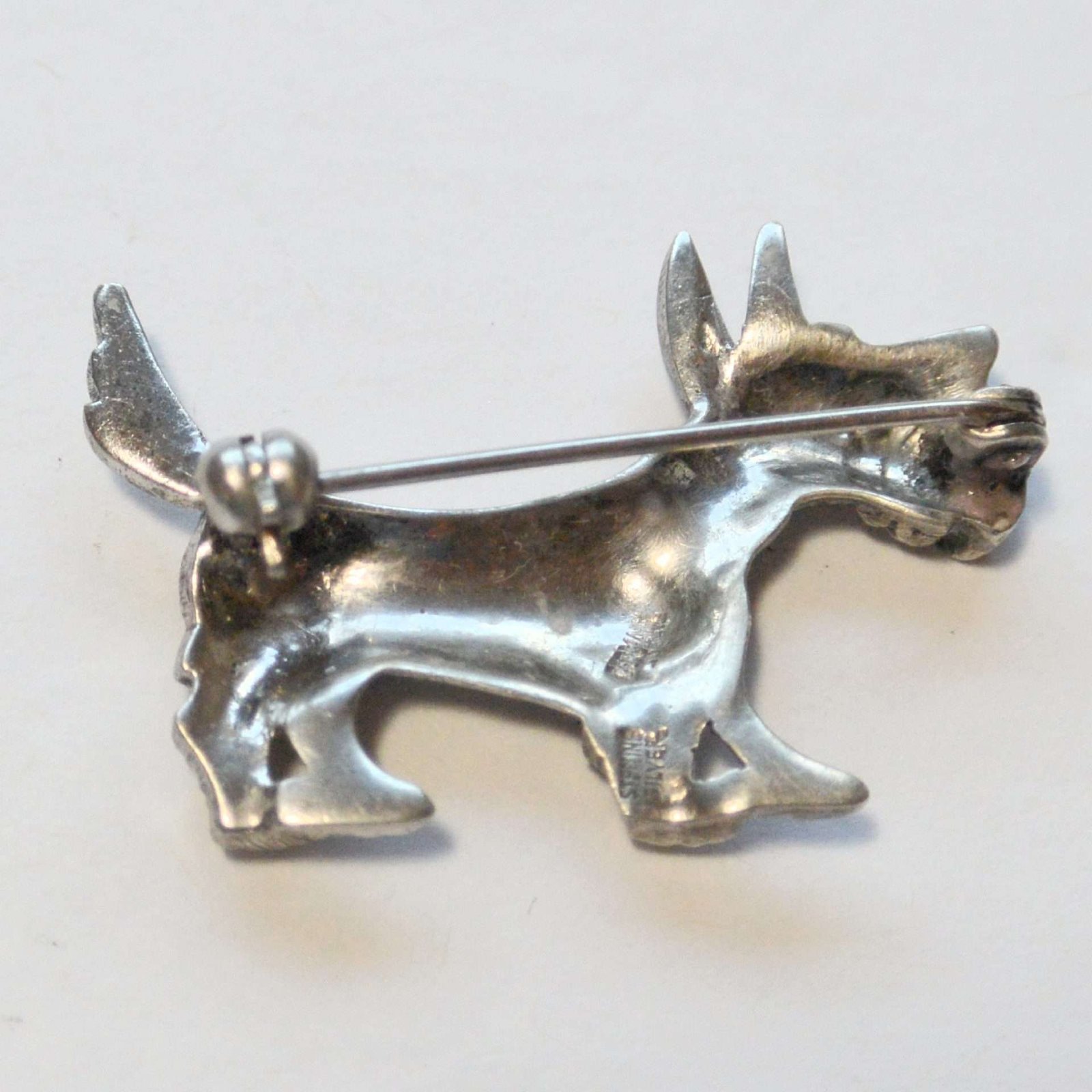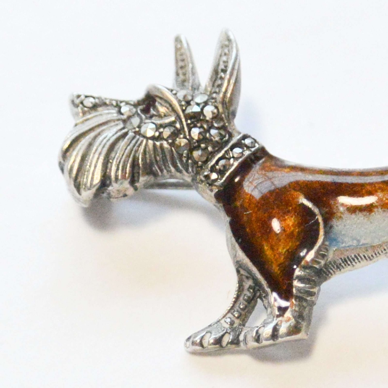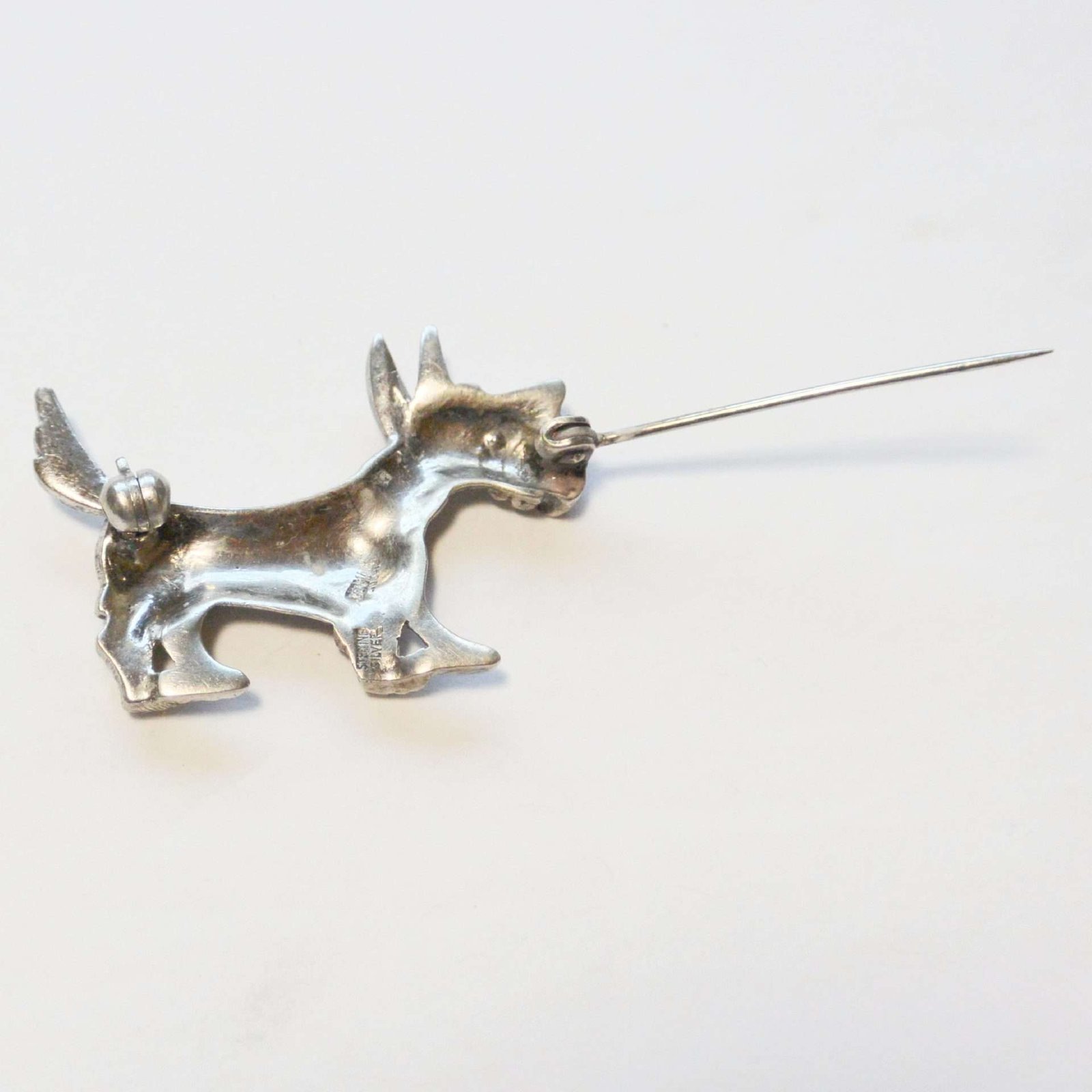 We purposely added close-ups of this fabulous Scottish Terrier pin, so that you can truly appreciate its combination of a sterling silver body, an enamel coat, marcasite accents, and a garnet eye.