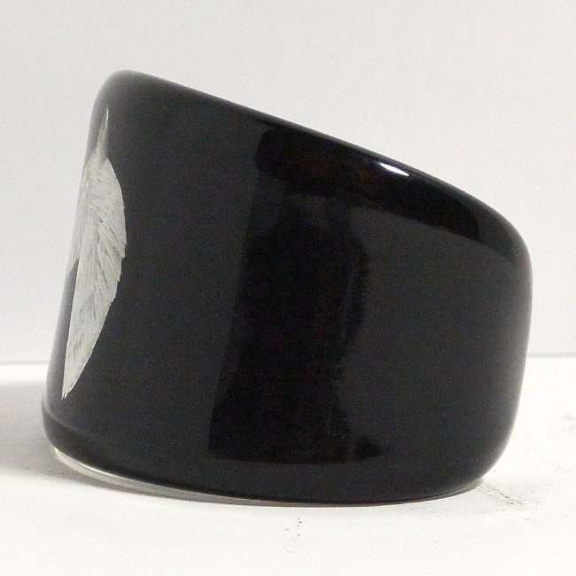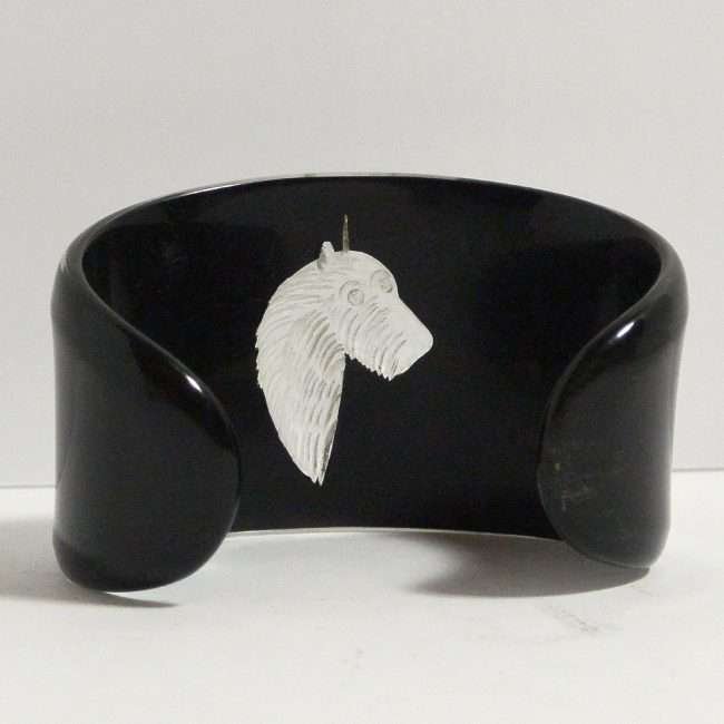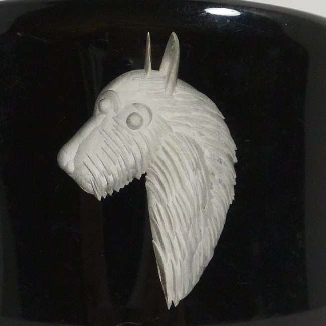 Done in a beautiful, ebony black lucite, it has a high gloss finish on the outside, to enhance and to protect the highly detailed etching of the head, in profile, of the Scottish Terrier dog.