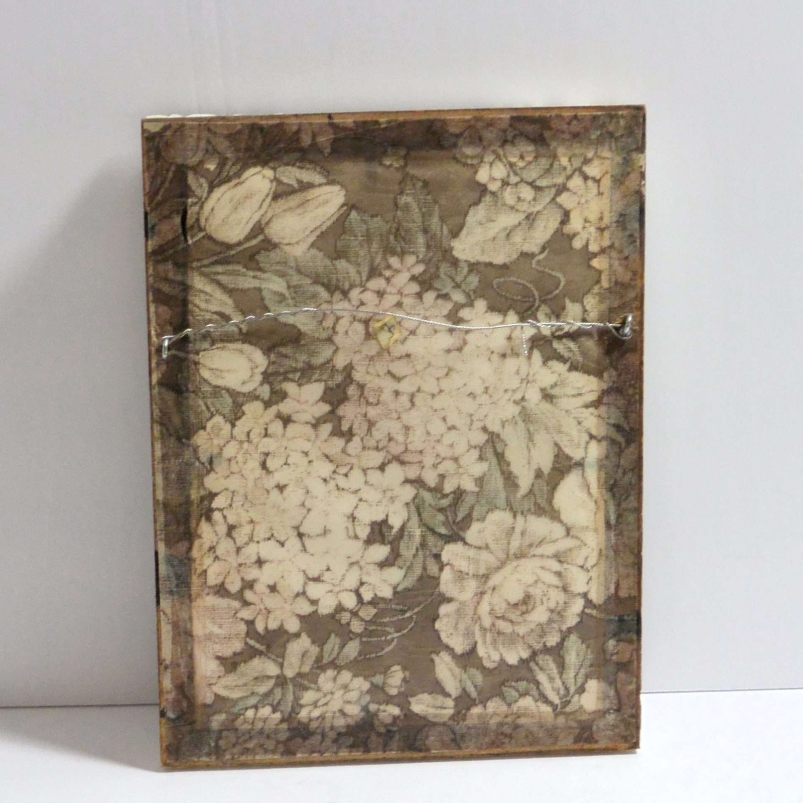 The title “Close Harmony”, and the artist’s signature are part of the printed page.  It is covered in glass, and framed in a vintage vanilla French provincial wood frame.The print is backed with what appears to be vintage floral wallpaper.