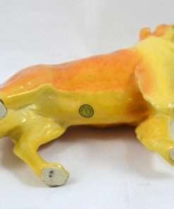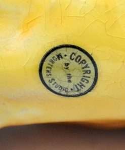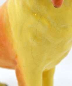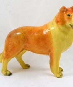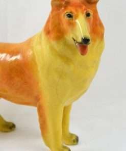 This wonderful Collie dog is one of Mortens Studios larger figurines. Standing elegantly at 6″ tall x 7″ long x 2 1/2″ wide, she is in near perfect condition, with very mild crazing and a hairline that runs down her chest and stops at the top of her left leg (see photo).