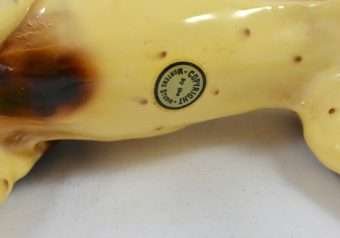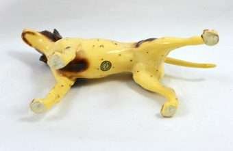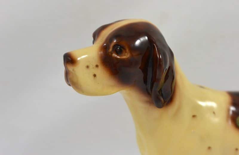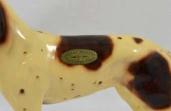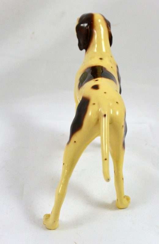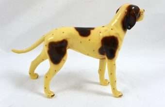 This exquisite figurine captures the gentle, devoted look of this German Short-Haired Pointer dog so well, it is almost difficult to pull your eyes away from it! Standing 5″ tall x 7″ long x 2 3/4″ wide, this dog carries all the poise and elegance of this sporting breed. This wonderful dog was designed and produced by Mortens Studio. The designer of this figurine, Oscar Morten, immigrated from Sweden to the U.S. and opened a giftware studio in Chicago in 1931. Over the next 32 years, he created over 300 popular dog and horse models. Composed of ceramic over a metal skeleton, these figurines, although beautiful and engaging, were prone to crazing and flaking, thus making it difficult, today, to find examples in perfect condition.