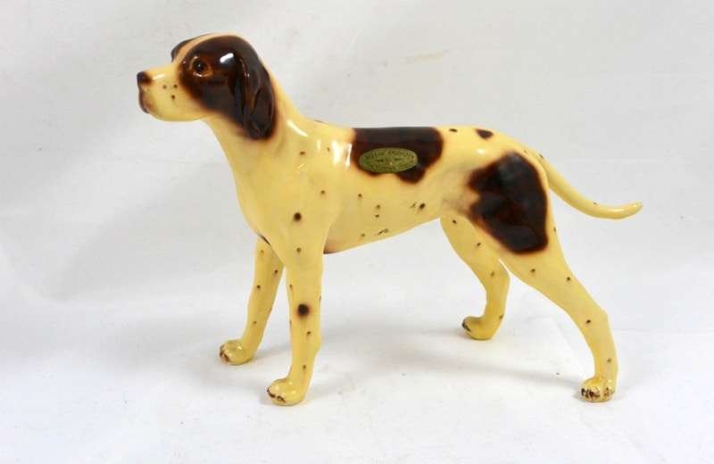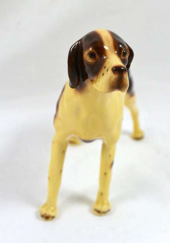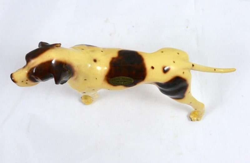 This exquisite figurine captures the gentle, devoted look of this German Short-Haired Pointer dog so well, it is almost difficult to pull your eyes away from it! Standing 5″ tall x 7″ long x 2 3/4″ wide, this dog carries all the poise and elegance of this sporting breed. This wonderful dog was designed and produced by Mortens Studio. The designer of this figurine, Oscar Morten, immigrated from Sweden to the U.S. and opened a giftware studio in Chicago in 1931. Over the next 32 years, he created over 300 popular dog and horse models. Composed of ceramic over a metal skeleton, these figurines, although beautiful and engaging, were prone to crazing and flaking, thus making it difficult, today, to find examples in perfect condition.
