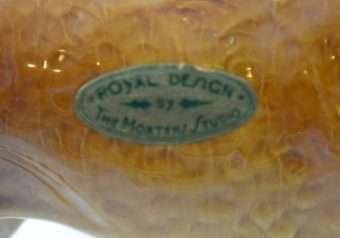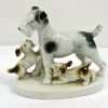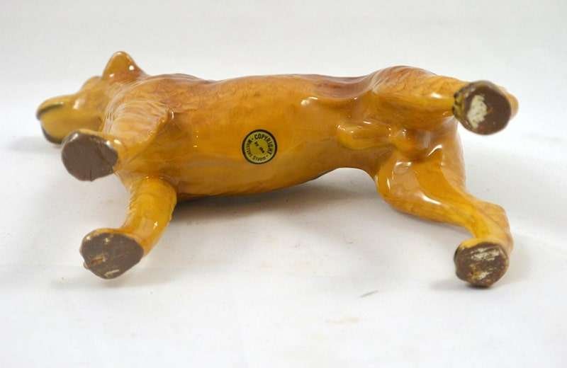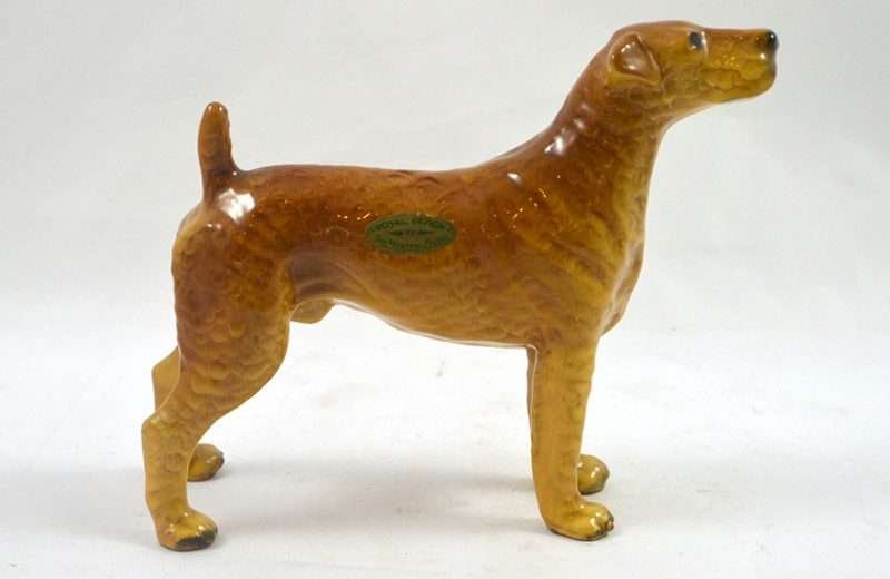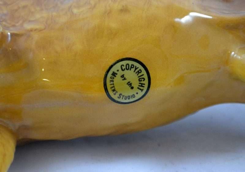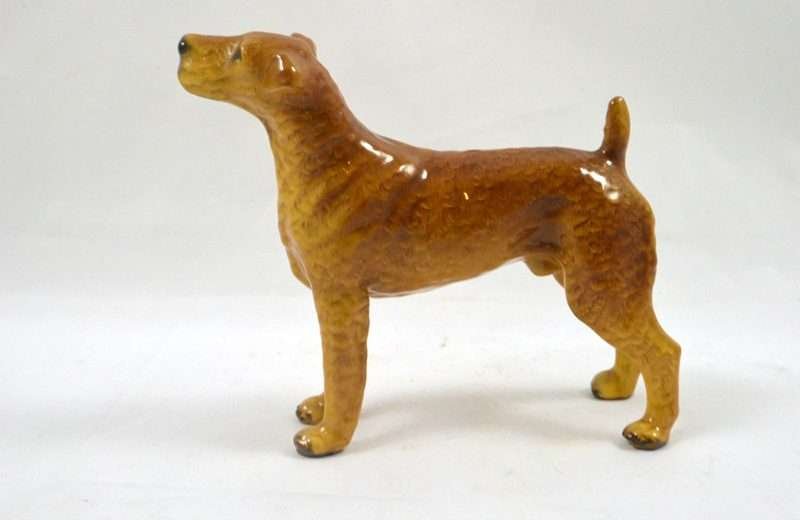 One of the “hard-to-find” Mortens Studio dog figurines, this elegant Welsh Terrier dog is in MINT condition! This happy, lively and devoted dog is the oldest existing breed in the UK, and sadly in danger of dying out…having as few as 300 puppies registered annually. The designer of this figurine, Oscar Morten, immigrated from Sweden to the U.S. and opened a giftware studio in Chicago in 1931. Over the next 32 years, he created over 300 popular dog and horse models. Composed of ceramic over a metal skeleton, these figurines, although beautiful and engaging, were prone to crazing and flaking, thus making it difficult, today, to find examples in perfect condition. A “must-have” for any collector of Mortens Studio dogs, and a unique and beautiful gift for any dog lover, this Welsh Terrier stands 4 1/2″ tall x 5″ long x 2″ wide. He is clearly marked on his underside and also has an intact foil label on his left side. If the history and the future of this wonderful dog doesn’t capture your attention, his thoroughly engaging face will!