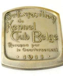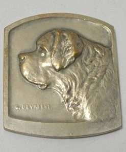 This exquisite, bronze Dog award medal was designed c.1911, and is signed by Godefroid Devereese, a famous Belgian engraver and artist of the Art Nouveau period. Measuring 1 3/4″ tall x 1 1/2″ wide, it has a gorgeously detailed and raised, side profile of a Saint Bernard. It is signed by the artist in the bottom left corner. On the reverse it says: 3rd Exposition of the Belgian Kennel Club, Recognized by the Government 1911.