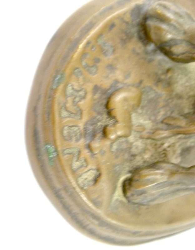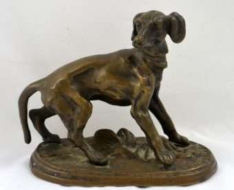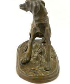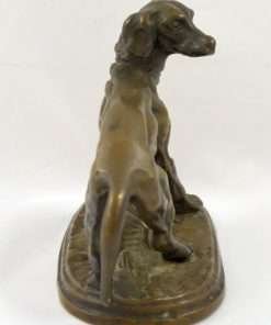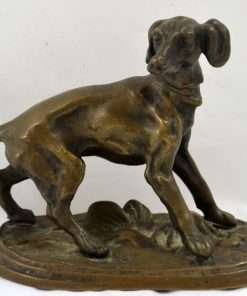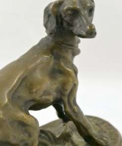 This extraordinary bronze miniature of a Setter dog has a wonderful deep brown patina, and is centered atop a stepped oval base, covered in what appears to be a bed of leaves. It is clearly inscribed “P.J. Mene” on the base just in front of the dog’s front paws. P.J. Mene is considered the pioneer of animal bronze sculpture in the 19th century, and also the foremost expert of that era in the process of lost wax casting. This dog has the classic stance and fine detailing that characterizes Mene’s work. This wonderful rendering of the dog shows musculature and an intent expression. This bronze dog would look fabulous on a desk or on a small side table. It is in excellent condition, standing 3 3/4″ tall x 4 1/2″ long x 2″ wide. As a gift, it would most certainly be a valued and much appreciated addition to any collection, or a classic addition to a special friend or family member’s home.