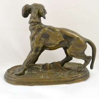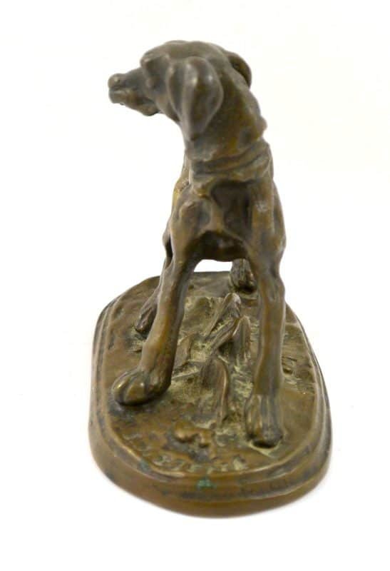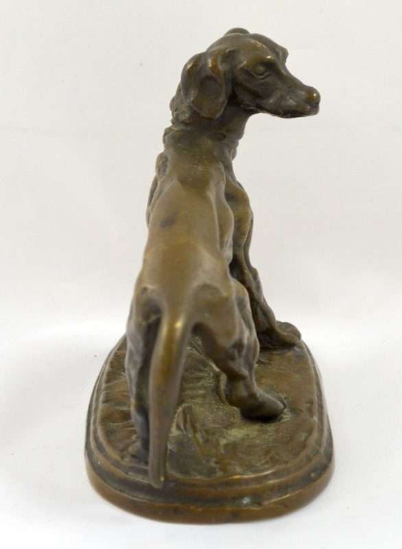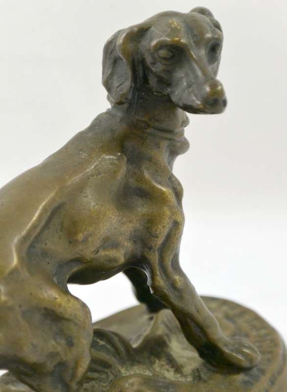 This extraordinary bronze miniature of a Setter dog has a wonderful deep brown patina, and is centered atop a stepped oval base, covered in what appears to be a bed of leaves. It is clearly inscribed “P.J. Mene” on the base just in front of the dog’s front paws.