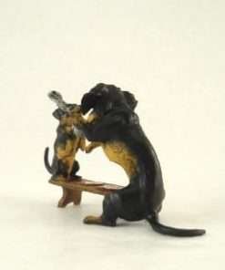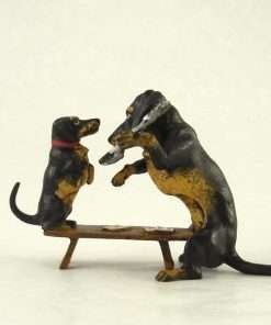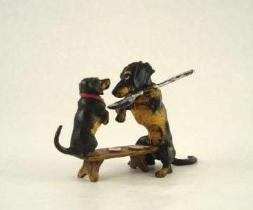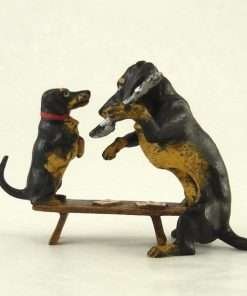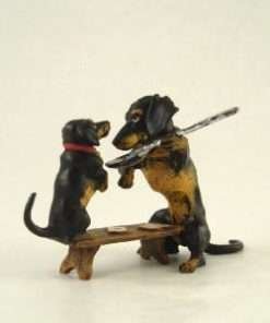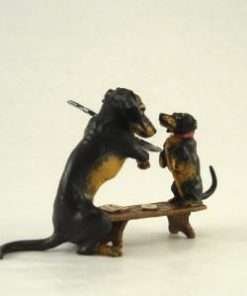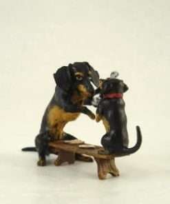 This wonderful, authentic Vienna Bronze mother Dachshund and pup were handmade and hand painted in Austria by the Bermann Company. It is marked with the golden “FBW” mark (Fritz Bermann Wien), and comes with a velvet pouch and a certificate of authenticity. This original work of art comes from the original model used by an elite group of craftsmen with a uniquely singular process, which began in Vienna in 1850.