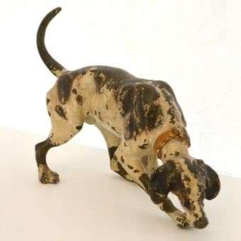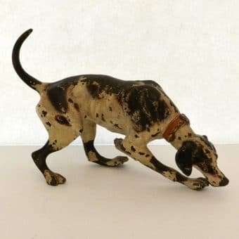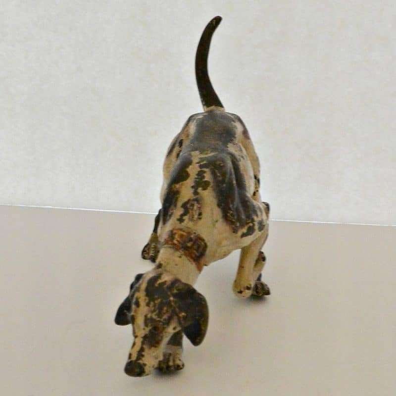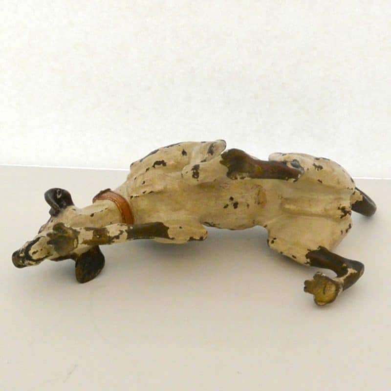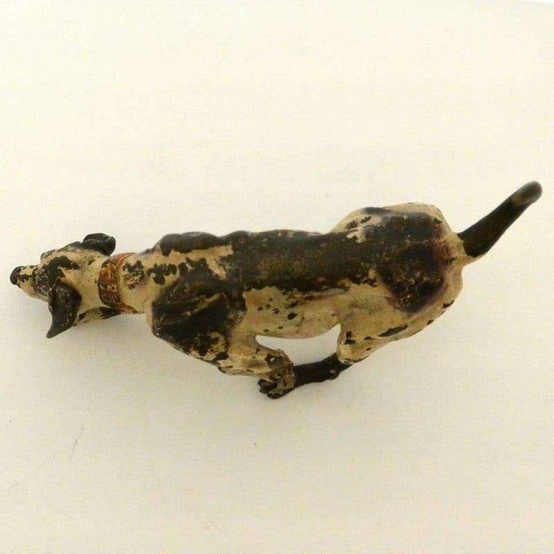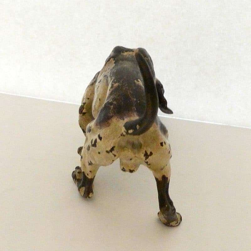 This fabulous cold painted bronze pointer dog may have lost some of his original paint, but none of his charm. Measuring a full 5″ tall x 8″ long x 2 3/4″ wide, he is beautifully detailed, including a wonderful, buckled collar.