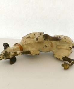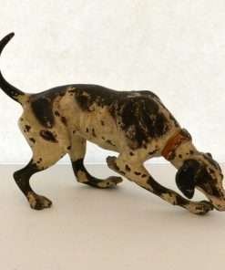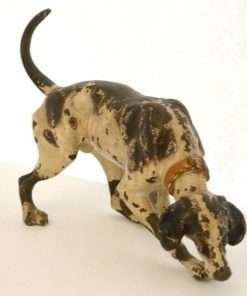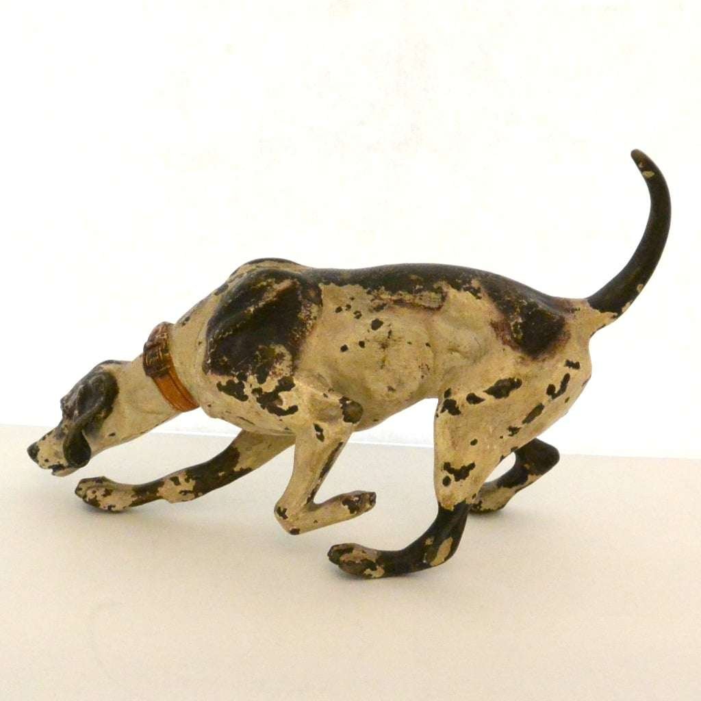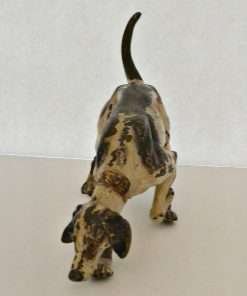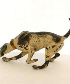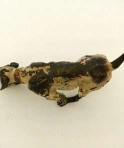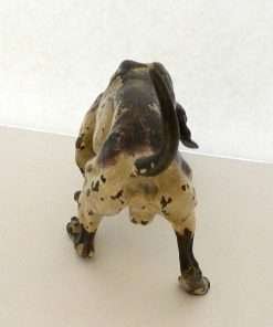 This fabulous cold painted bronze pointer dog may have lost some of his original paint, but none of his charm. Measuring a full 5″ tall x 8″ long x 2 3/4″ wide, he is beautifully detailed, including a wonderful, buckled collar.