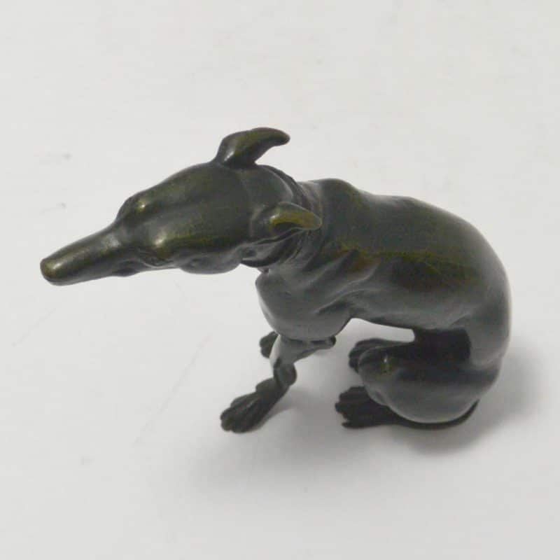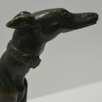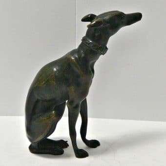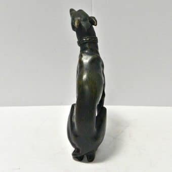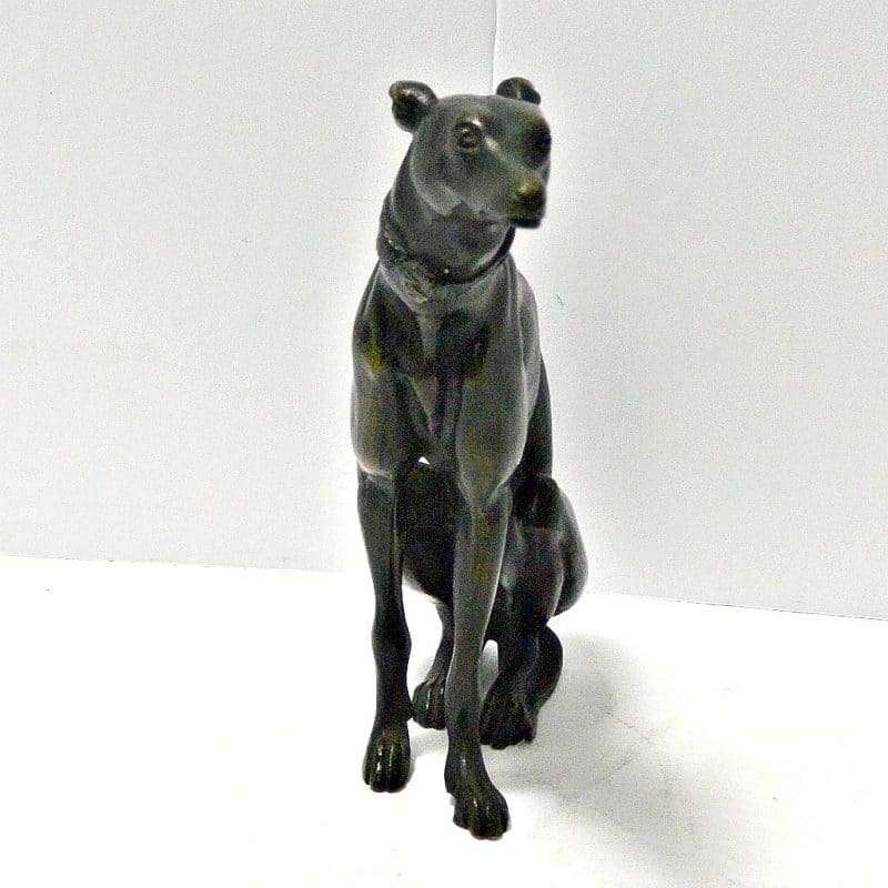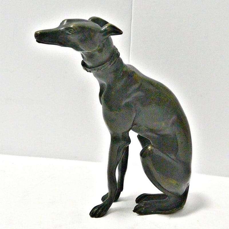 This exquisite, seated bronze Greyhound figurine was made in France. At 6 1/4″ tall x 5 1/4″ long x 2″ wide, it is so elegantly rendered. The detailing is tremendous, from her piercing gaze, to her collar, and all the way down to her toes.