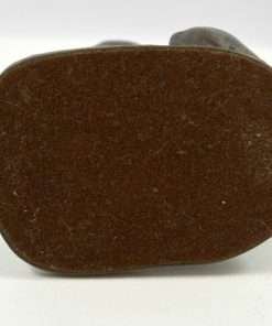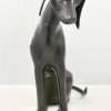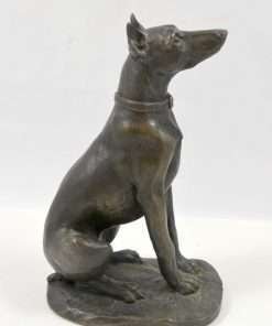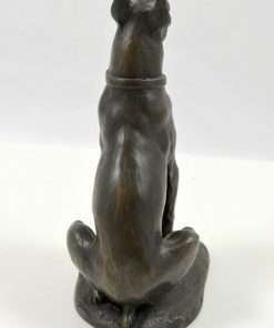 The beauty and strength of this extraordinary bronze Doberman Pinscher dog is so apparent in his focused gaze and alert posture. The details are just fabulous! His eyes, ears, muscles and detailed paws and collar add up to a bronze that is so life like, you find yourself waiting for it to move! He proudly sits 5″ tall on a bronze base that is 3″ long and 2″ wide, and signed J. Spouse (Jean Spouse, English b. 1949). This bronze dog is in excellent condition, with a beautiful patina. What a great gift for owners of this powerful and wonderful breed!