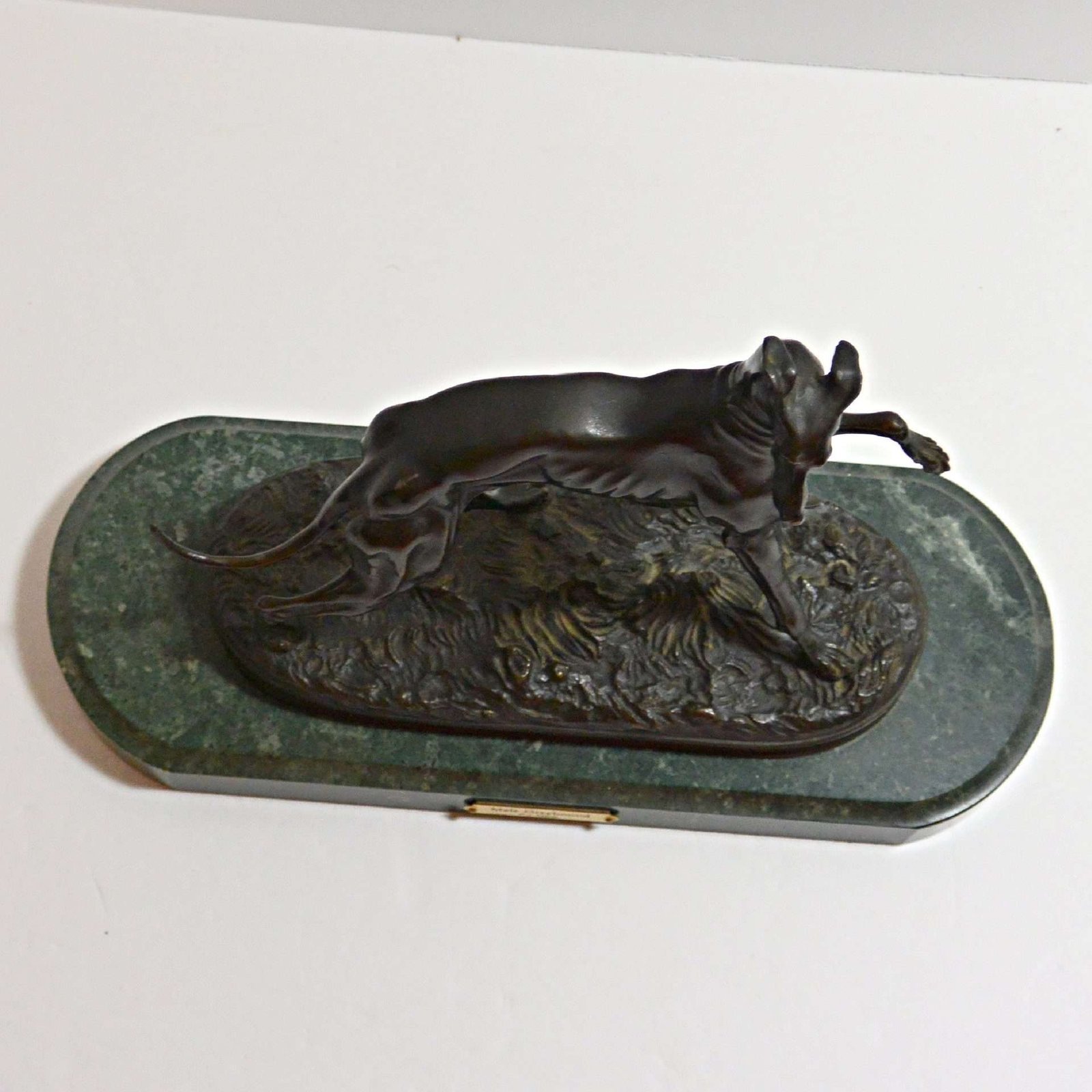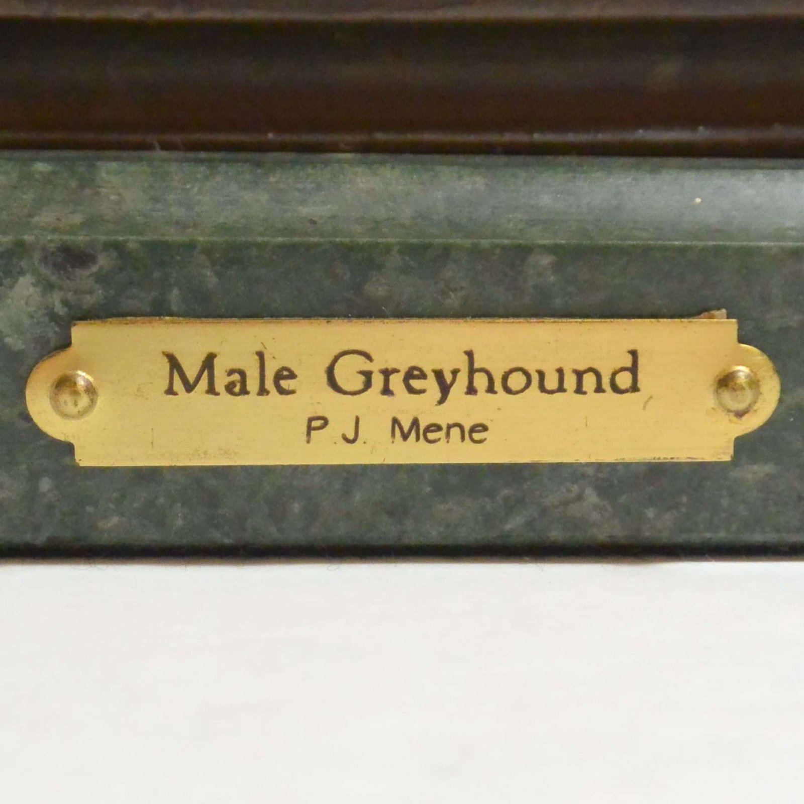 It depicts the dog poised, looking down with one paw raised. The figurine is stamped “P J Mene”, and it is mounted to a very heavy marble plinth.
